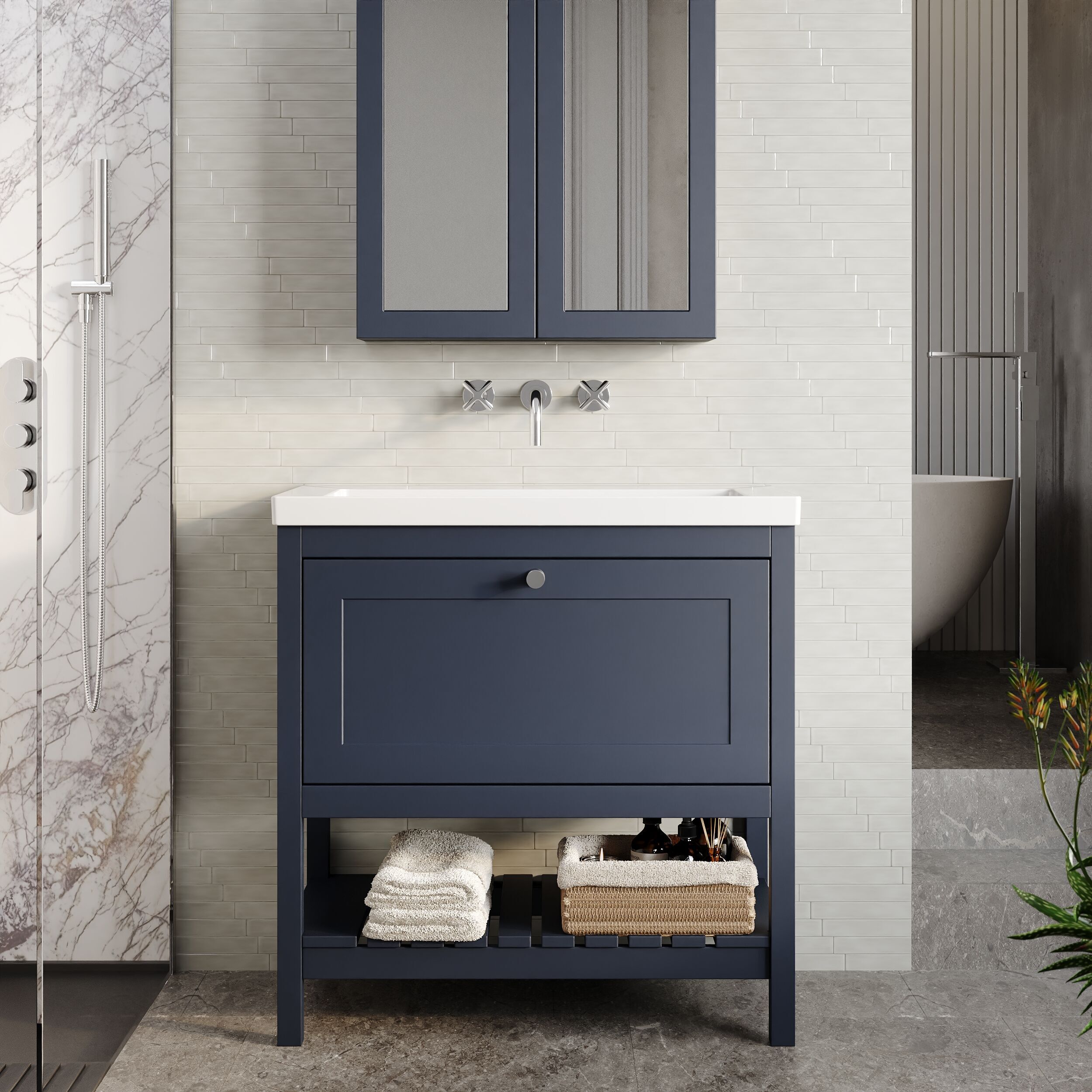 Hudson Reed Bexley Floor Standing 1 Drawer Vanity & 0 Tap Hole Contemporary Fireclay Basin, 800mm - Indigo Blue
