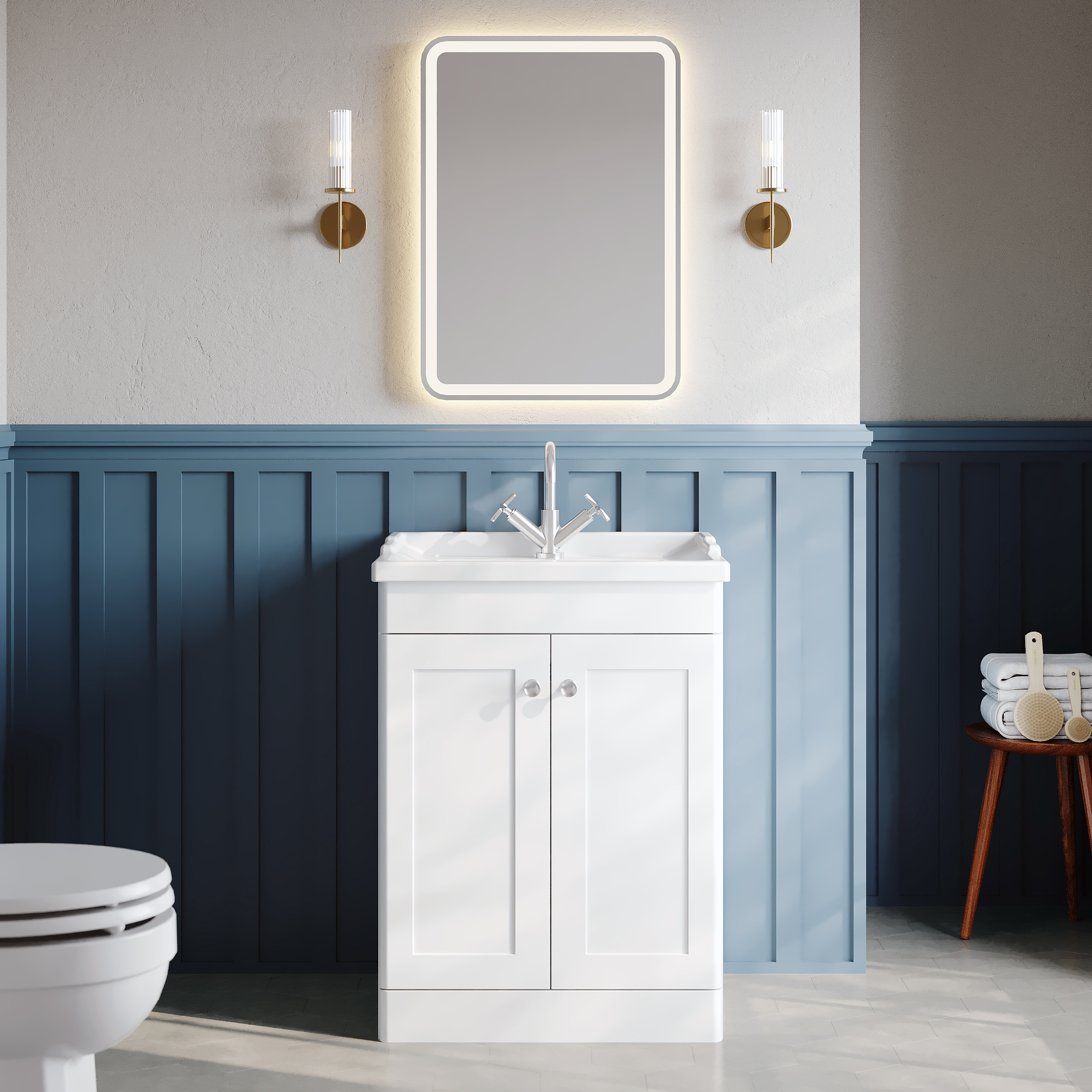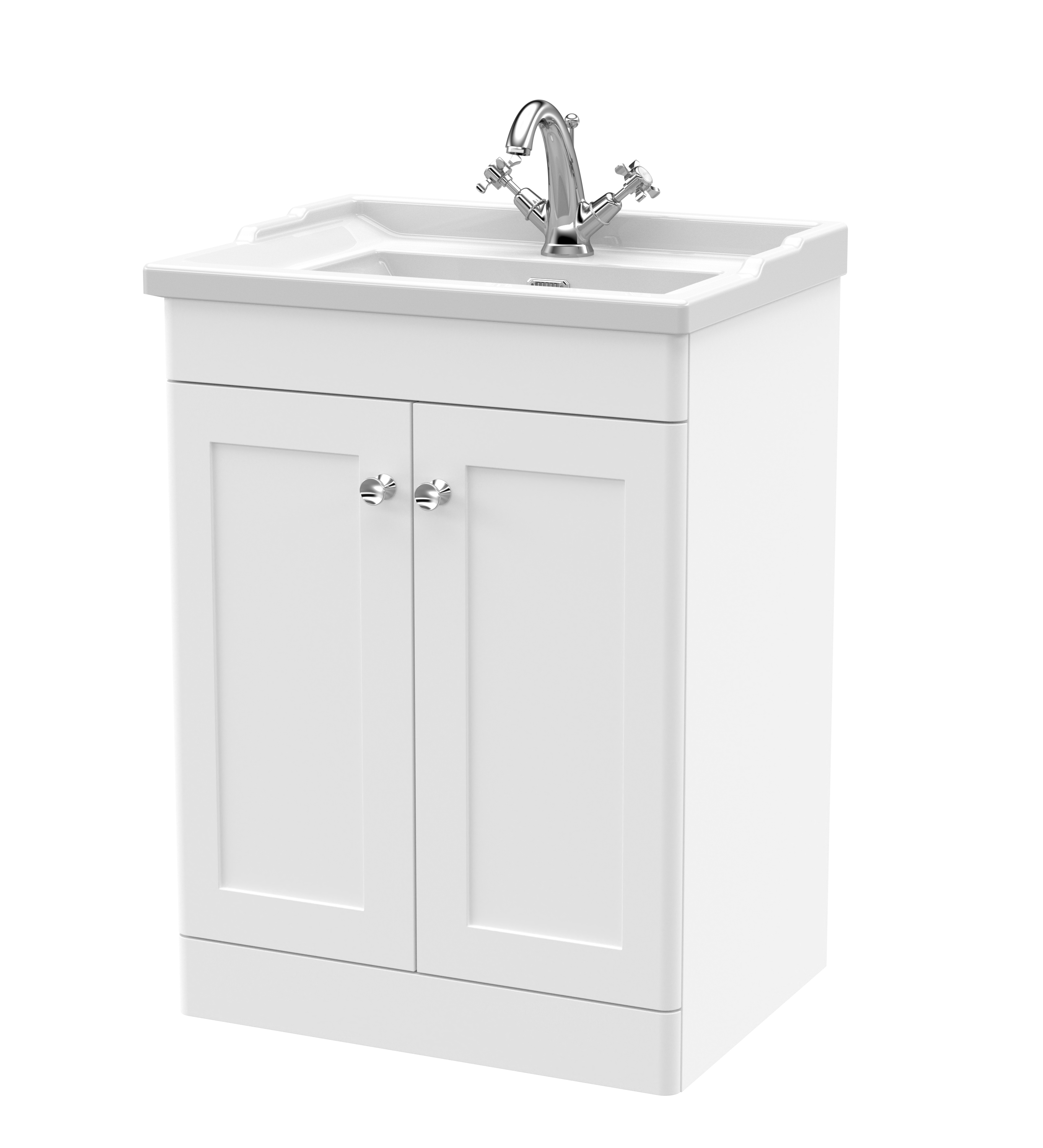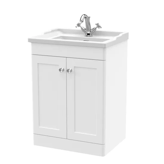 Nuie Classique 600mm Satin White Floor Standing 2 Door Vanity Basin Unit With 3 Tap Hole Basin