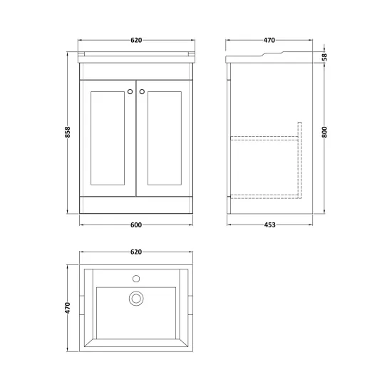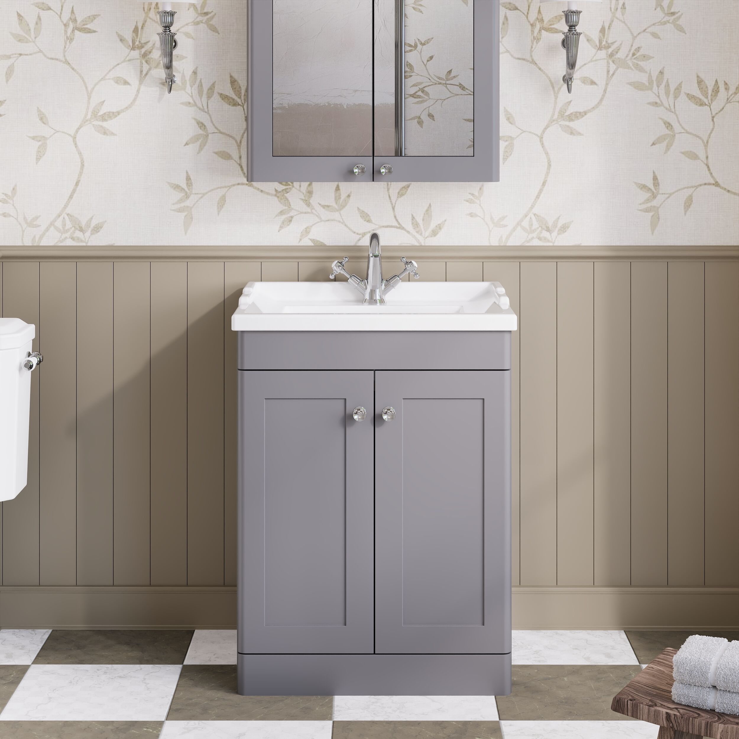Nuie Classique 600mm Satin Grey Traditional Floor Standing 2 Door Vanity Unit With 3 Tap Hole Basin