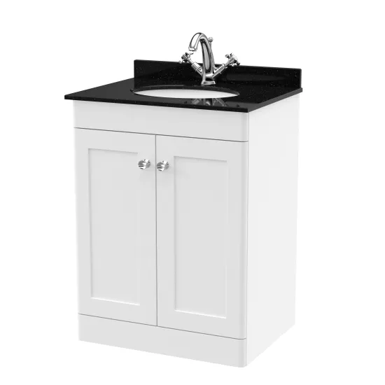 Nuie Classique 600mm Satin White Floor Standing 2 Door Vanity Basin Unit With 3 Tap Hole Basin