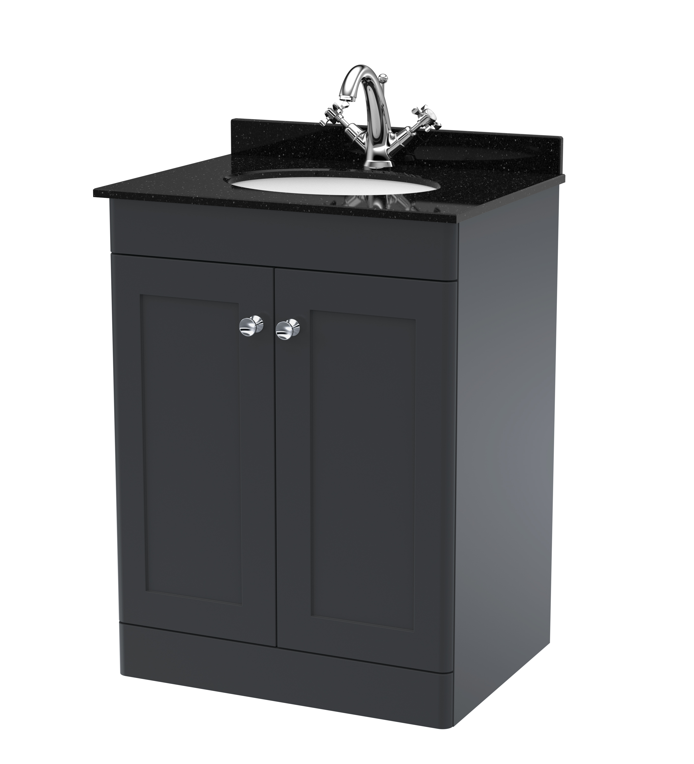Nuie Classique 600mm Soft Black Floor Standing 2 Door Vanity Basin Unit with 3 Tap Hole Basin & Chrome Handles