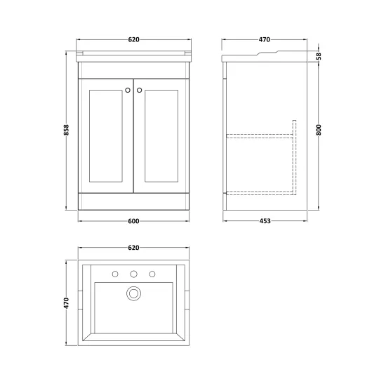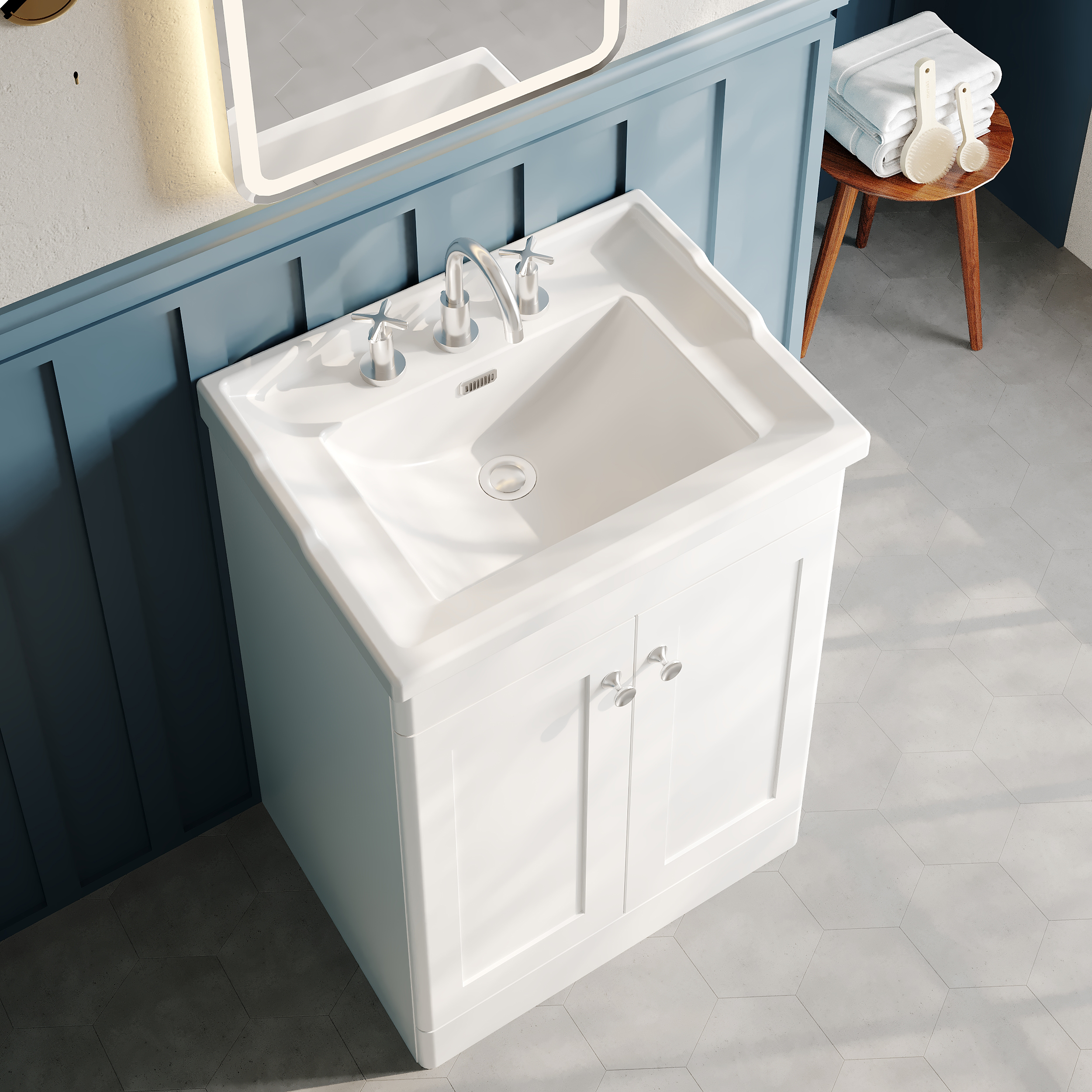 Nuie Classique 600mm Satin White Floor Standing 2 Door Vanity Basin Unit With 3 Tap Hole Basin