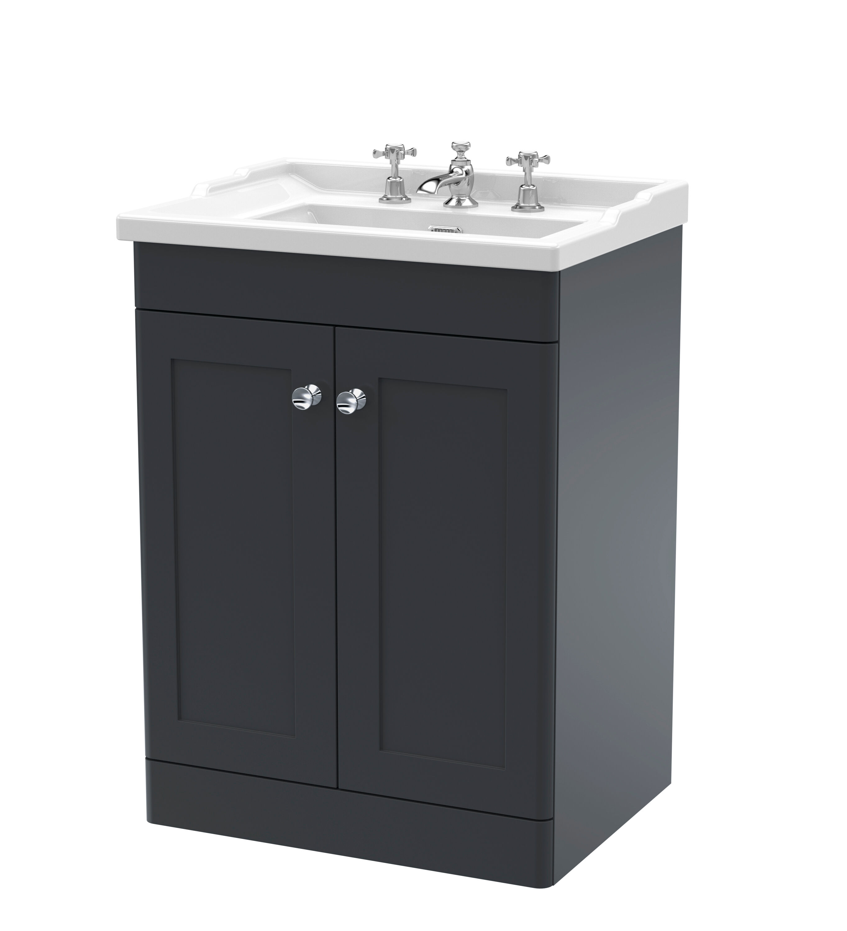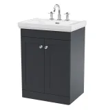 Nuie Classique 600mm Soft Black Floor Standing 2 Door Vanity Basin Unit with 3 Tap Hole Basin & Chrome Handles