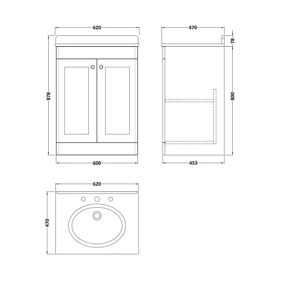 Nuie Classique 600mm Satin White Floor Standing 2 Door Vanity Basin Unit With 3 Tap Hole Basin