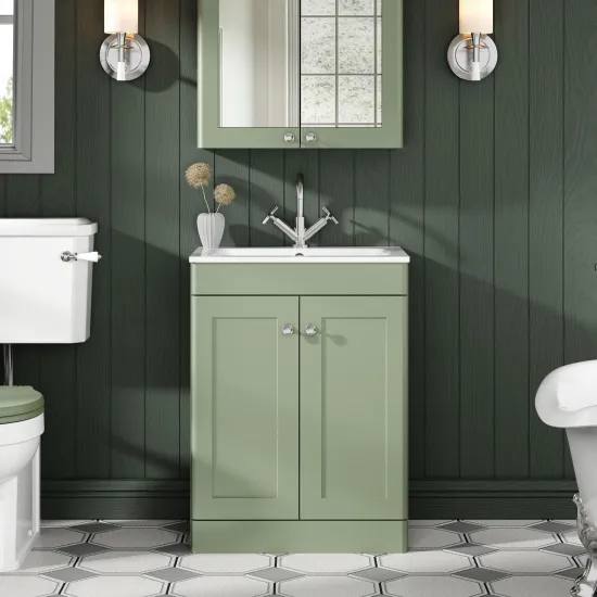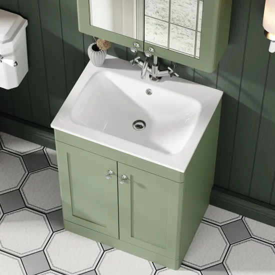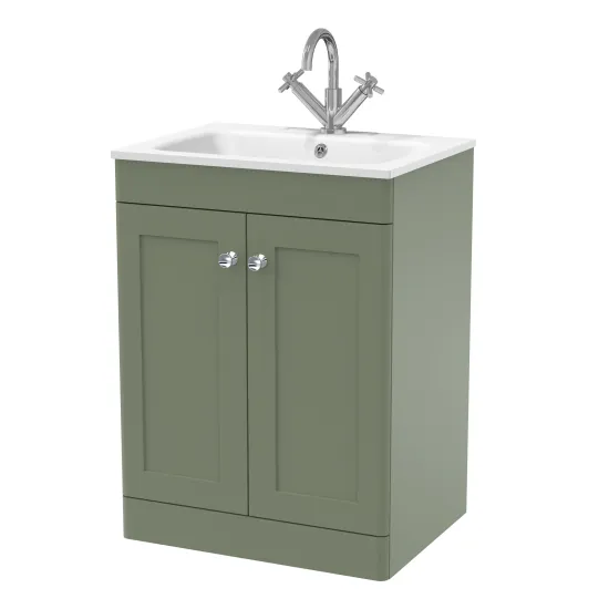 nuie Classique Floor Standing 2 Door Vanity Basin Unit & 1 Tap Hole Stone Basin, 600mm - Satin Green