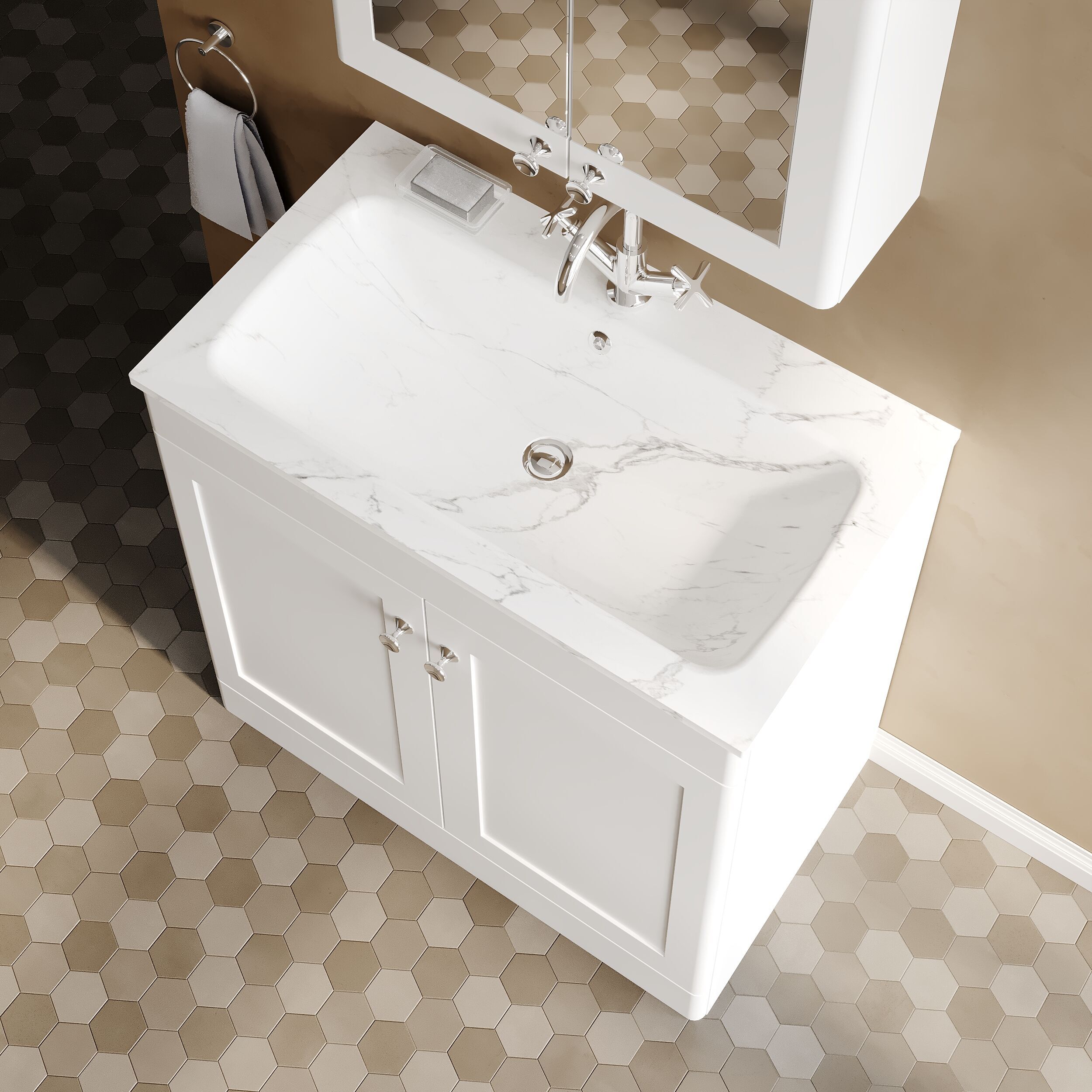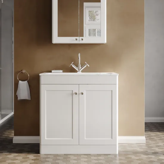 nuie Classique Floor Standing 2 Door Vanity Basin Unit & 1 Tap Hole Stone Basin, 800mm - Satin White