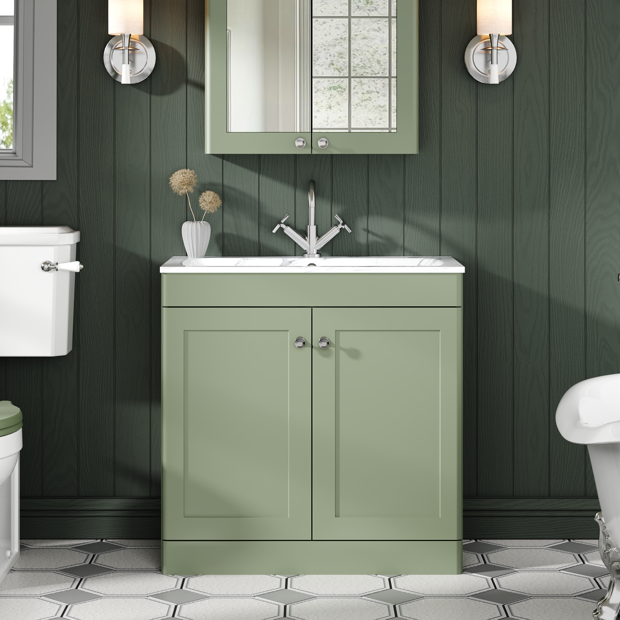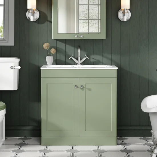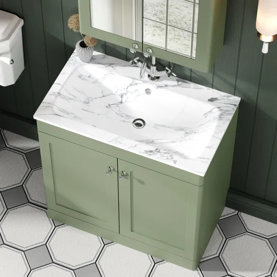 nuie Classique Floor Standing 2 Door Vanity Basin Unit & 1 Tap Hole Stone Basin, 800mm - Satin Green