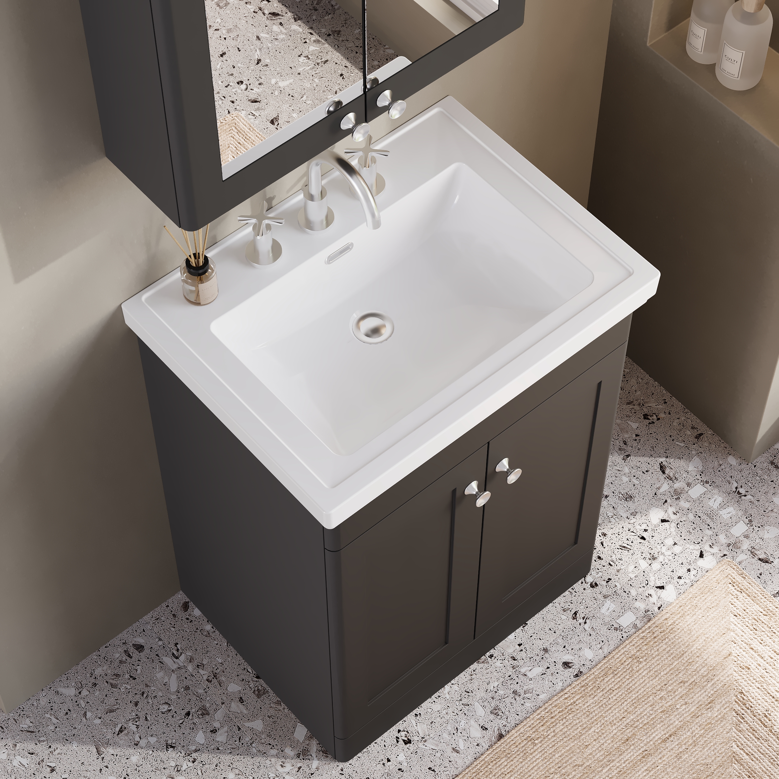 Nuie Classique 630mm Satin Grey Traditional Floor Standing 2 Door Vanity Unit With 3 Tap Hole Basin