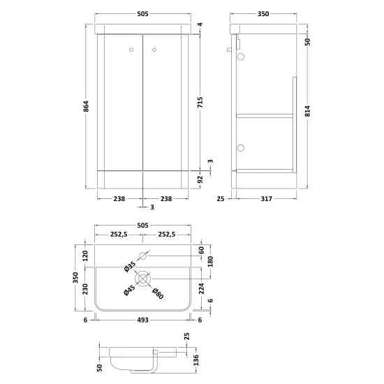 Nuie 505mm Soft Black Floor Standing 2 Door Vanity Basin Unit With Ceramic Basin