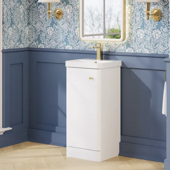 Nuie 400mm Satin Green Floor Standing 1 Door Vanity Unit With Ceramic Basin & 1 Tap Hole