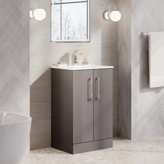 Nuie 500mm Satin Grey Fluted Floor Standing 2-Door Vanity Unit & Basin With Chrome Handles