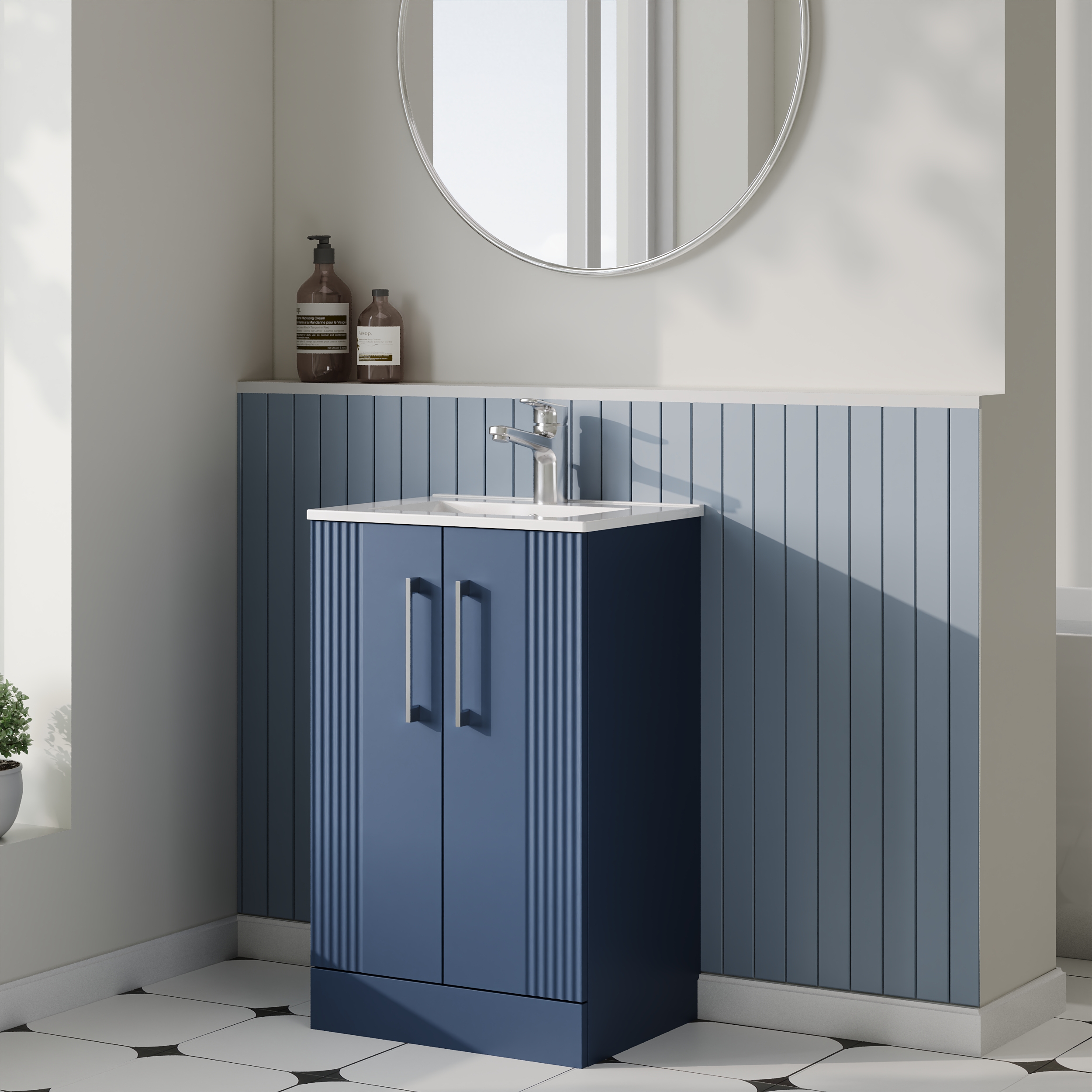 Nuie 500mm Part Fluted Satin Blue Floor Standing 2 Door Vanity Unit With Basin & Chrome Handles