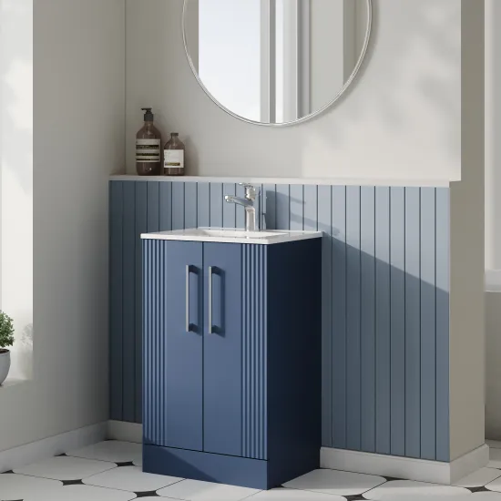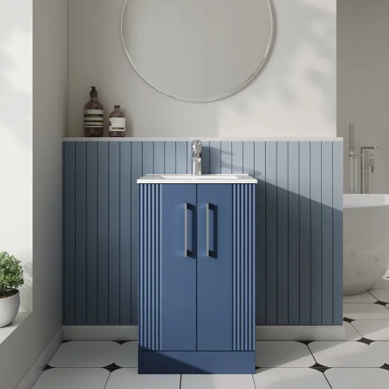 Nuie 500mm Part Fluted Satin Blue Floor Standing 2-Door Vanity Unit with Basin & Chrome Handles
