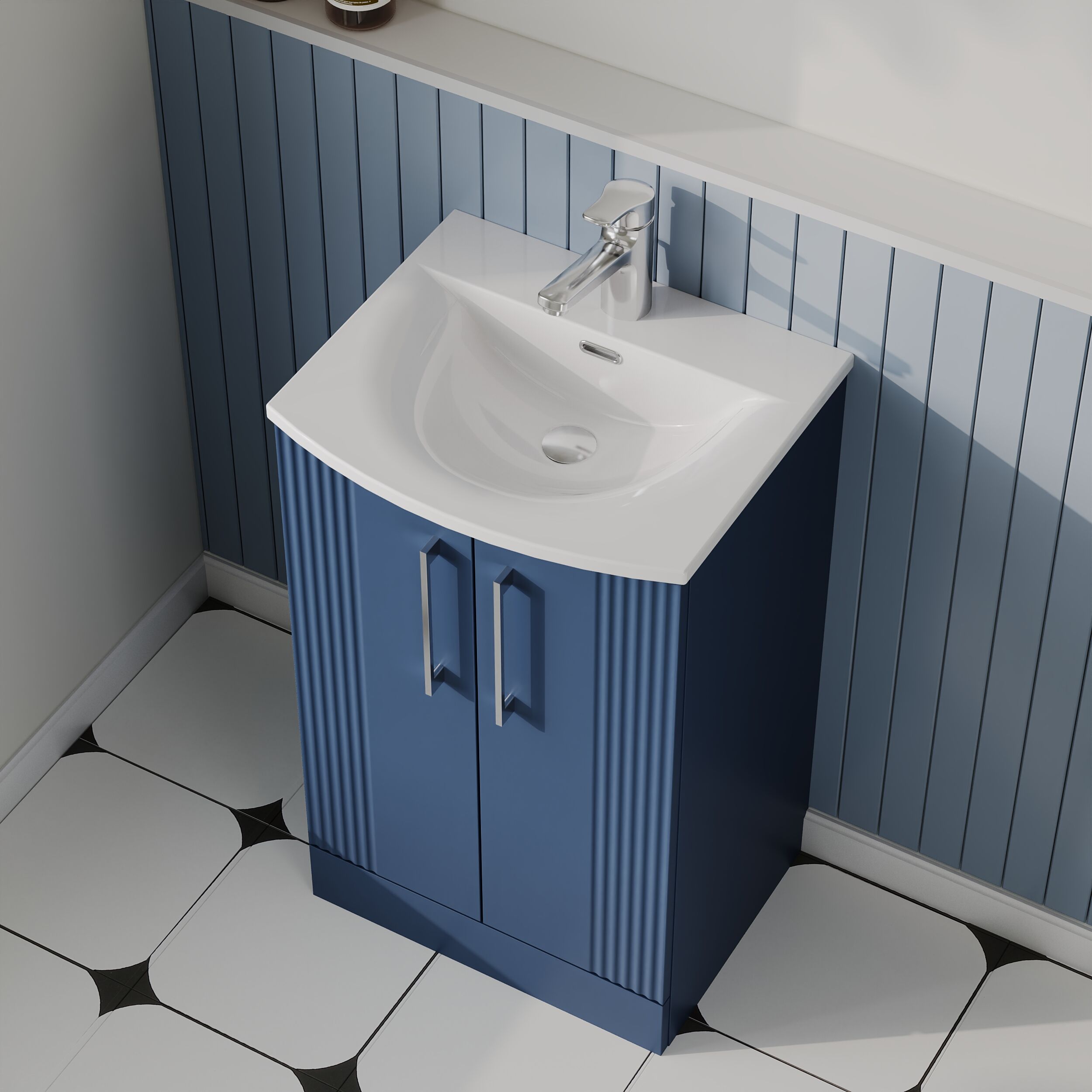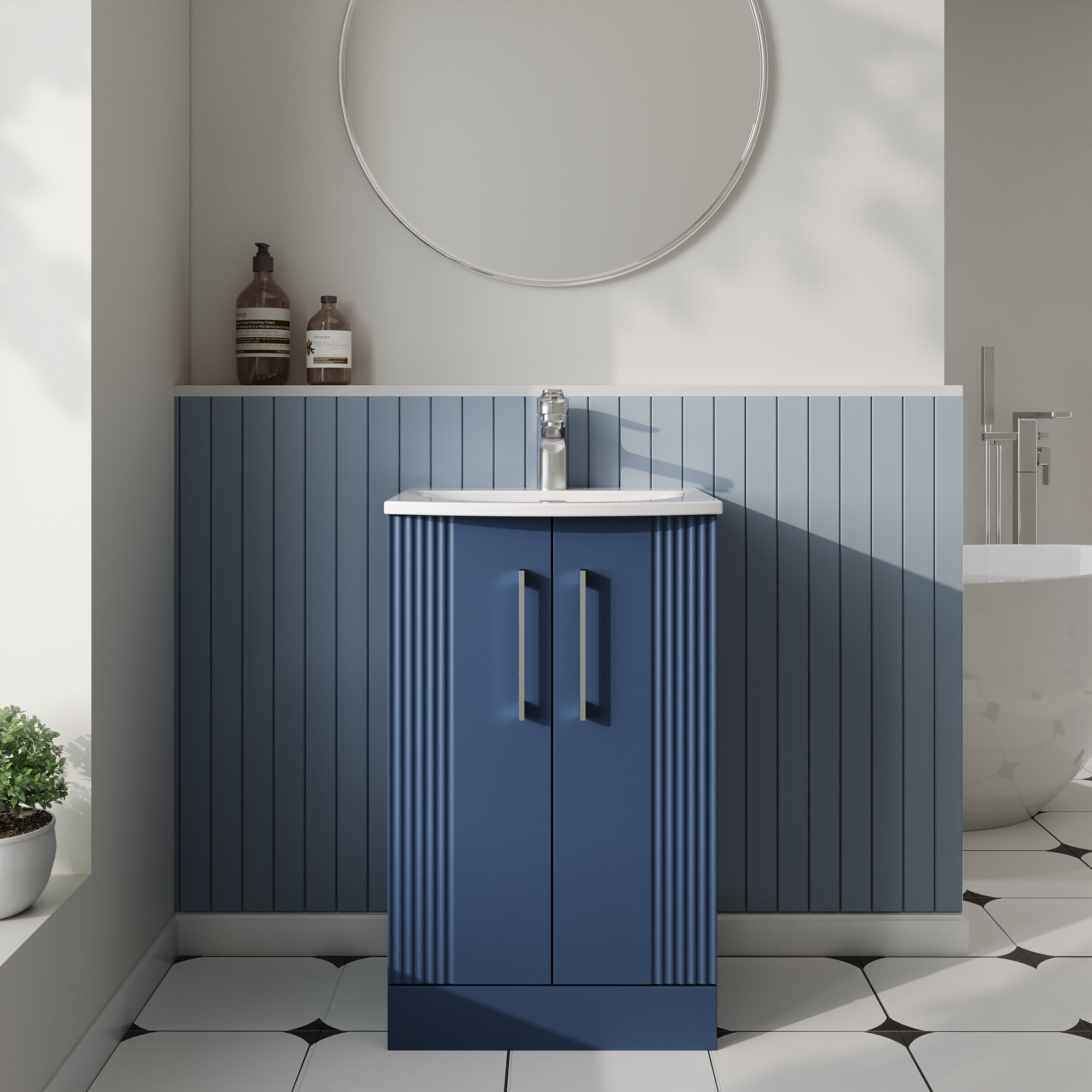 Nuie 500mm Part Fluted Satin Blue Floor Standing 2 Door Vanity Unit With Basin & Chrome Handles