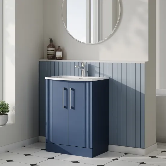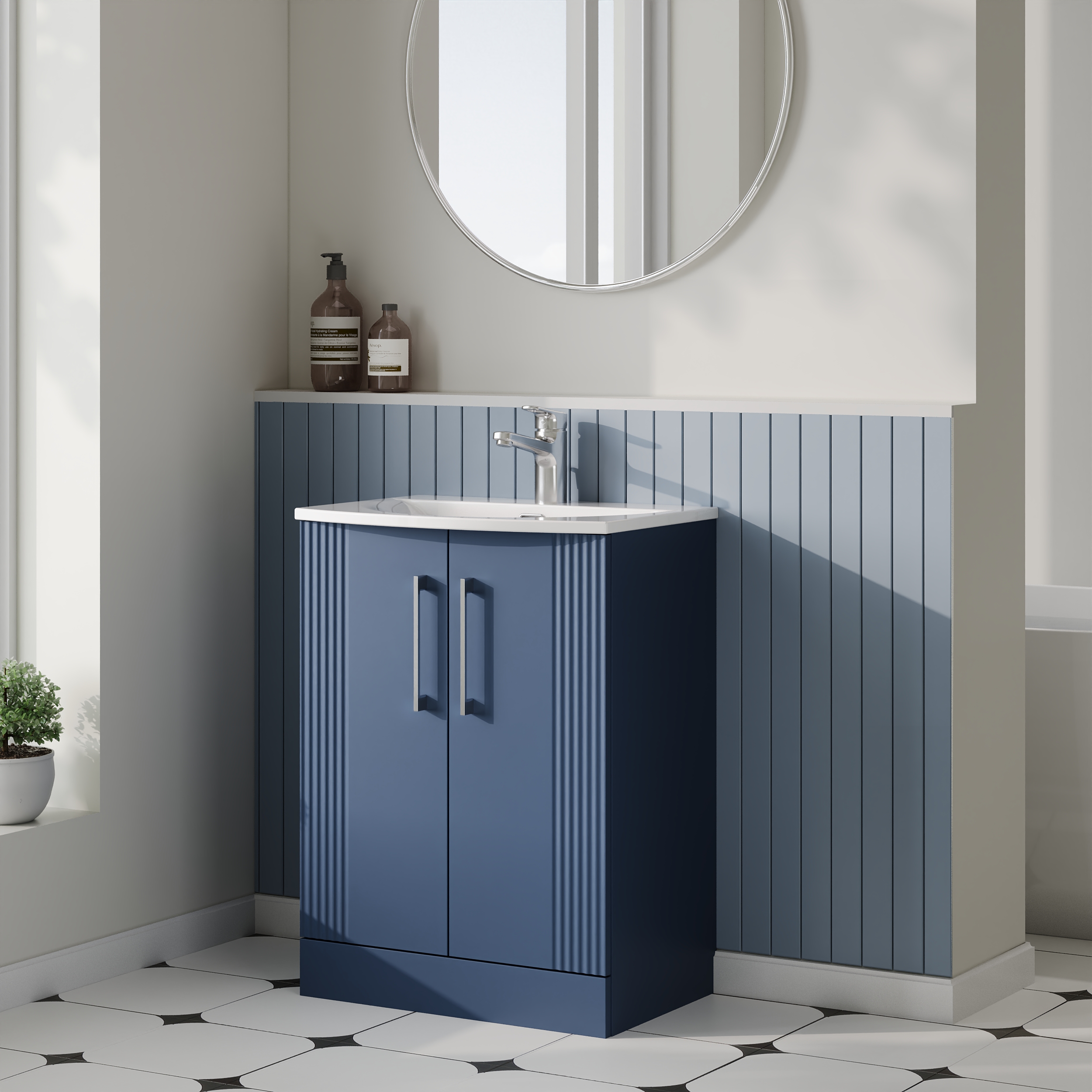 Nuie 600mm Satin Blue Fluted Floor Standing 2-Door Vanity Unit with Basin Including Chrome Handles