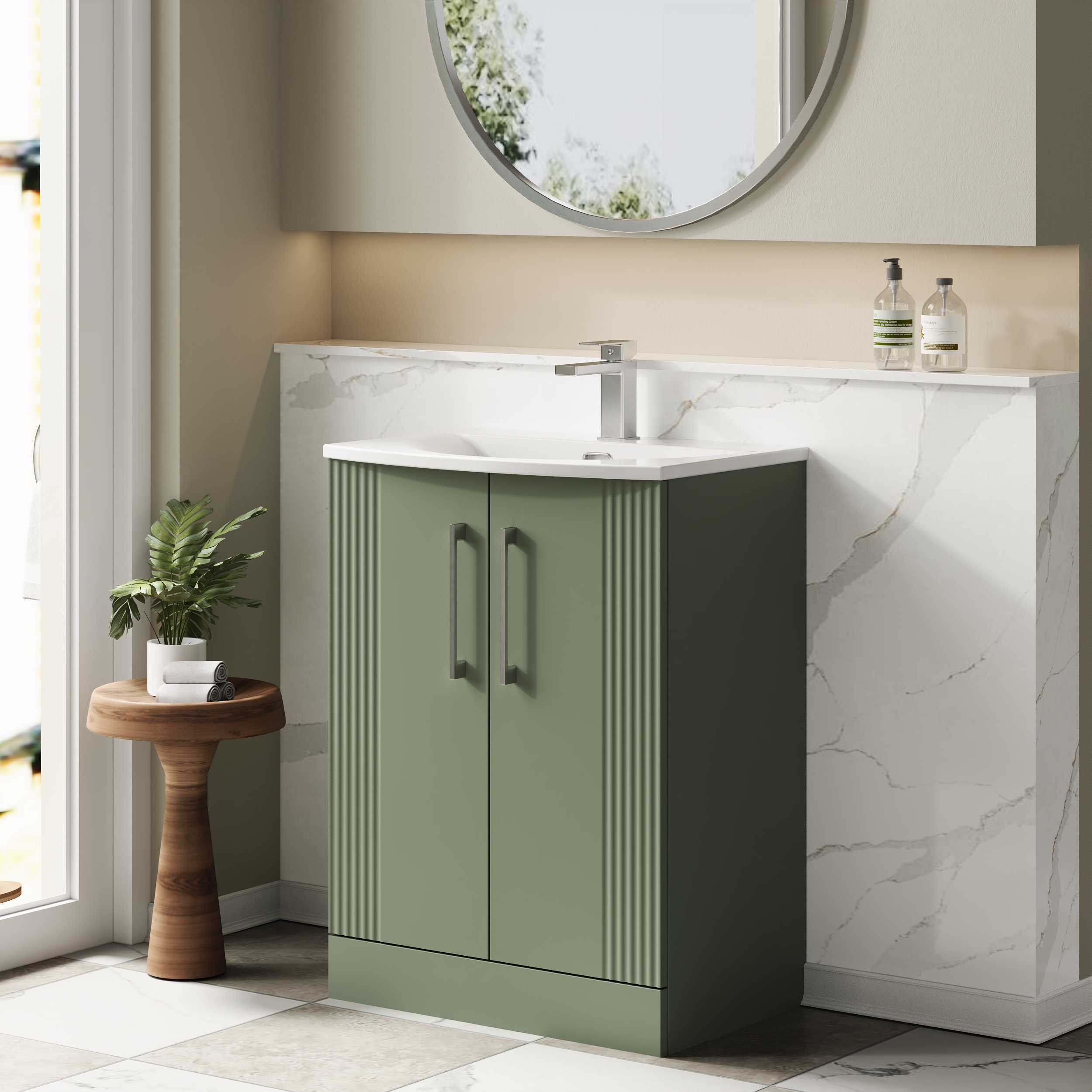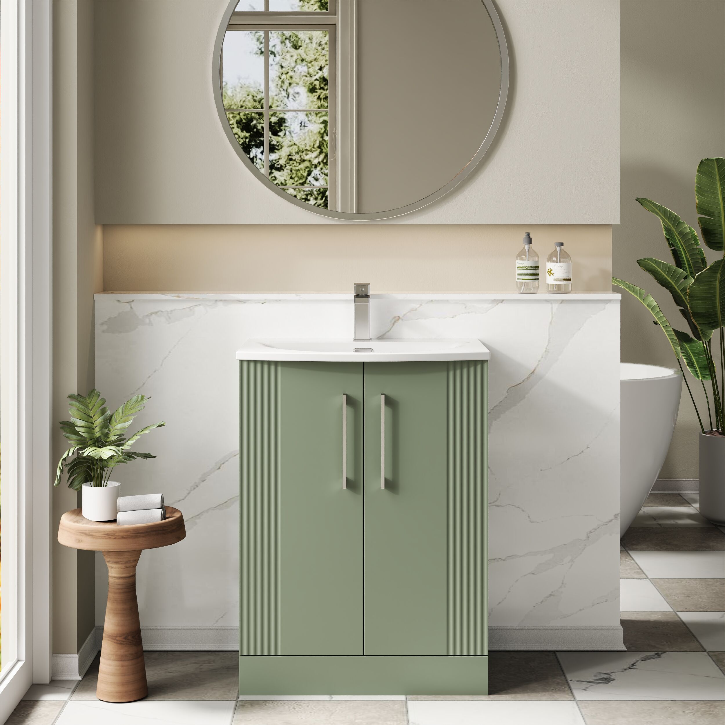 Nuie 600mm Satin Green Fluted Floor Standing 2-Door Vanity Unit & Basin With Chrome Handles