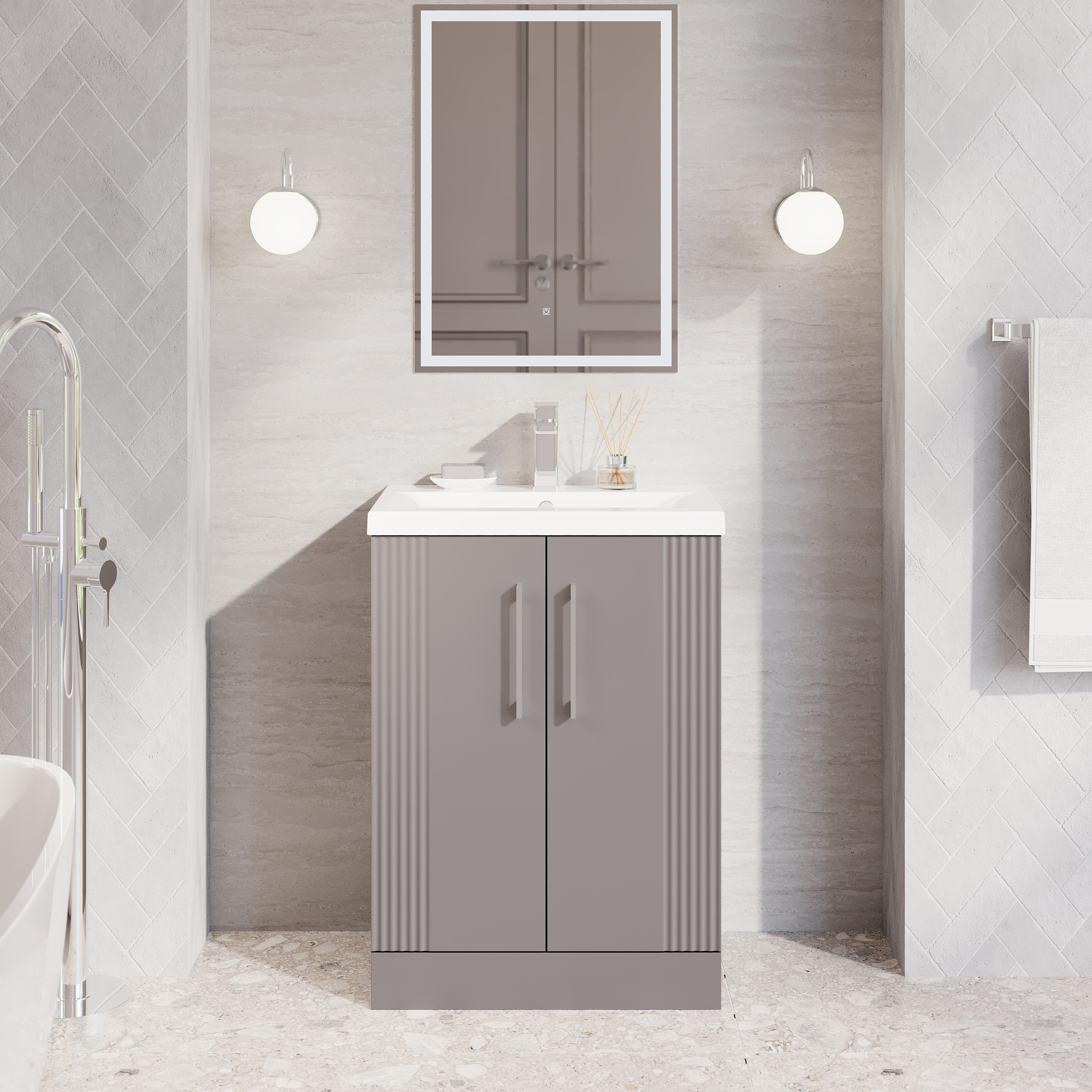 Nuie 600mm Part Fluted Satin Grey Floor Standing 2-Door Vanity Unit with Basin & Chrome Handles