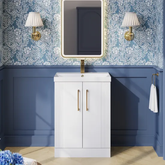 Nuie Part Fluted 600mm Satin White Floor Standing 2-Door Vanity Unit with Basin With Chrome Handles