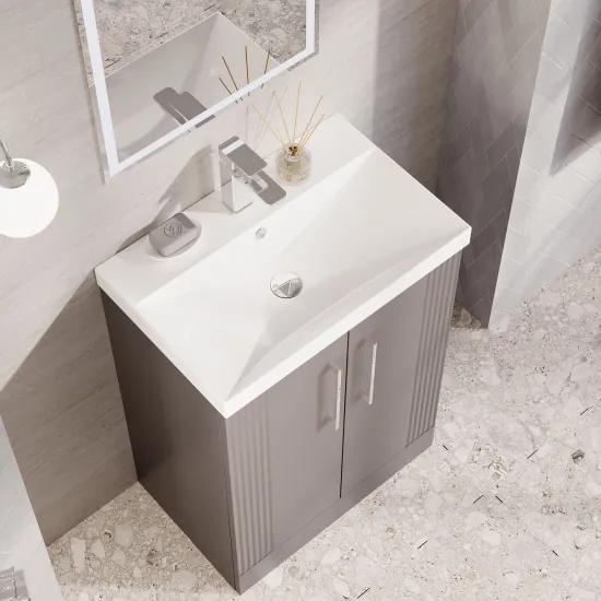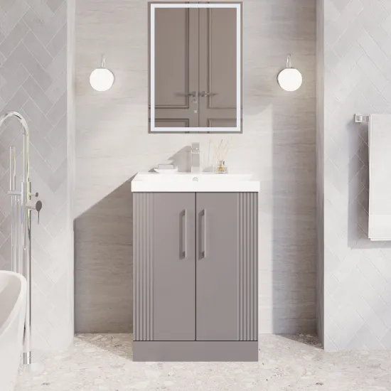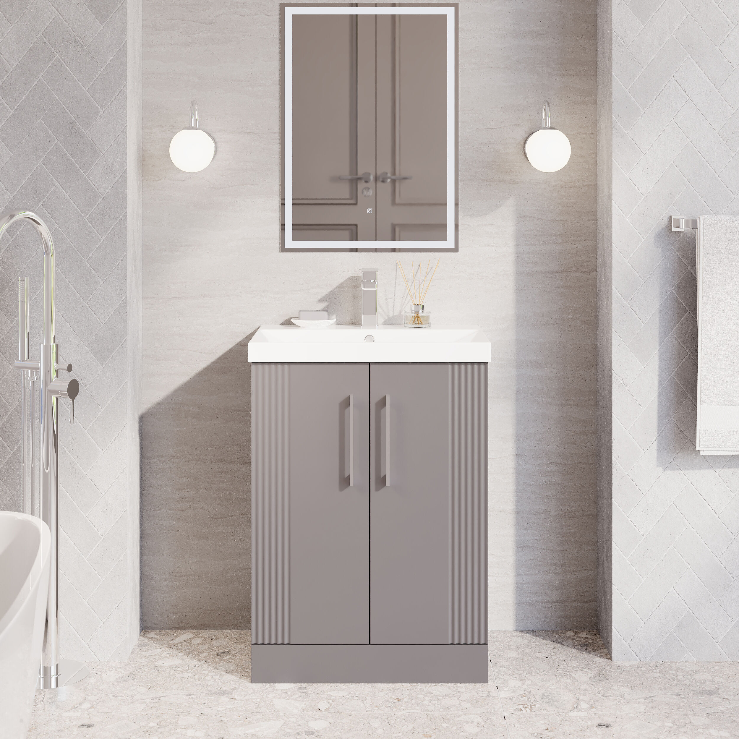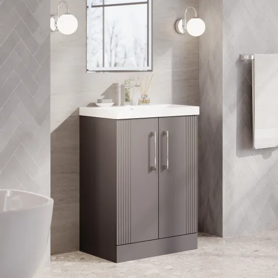 Nuie 600mm Part Fluted Satin Grey Floor Standing 2-Door Vanity Unit with Basin & Chrome Handles