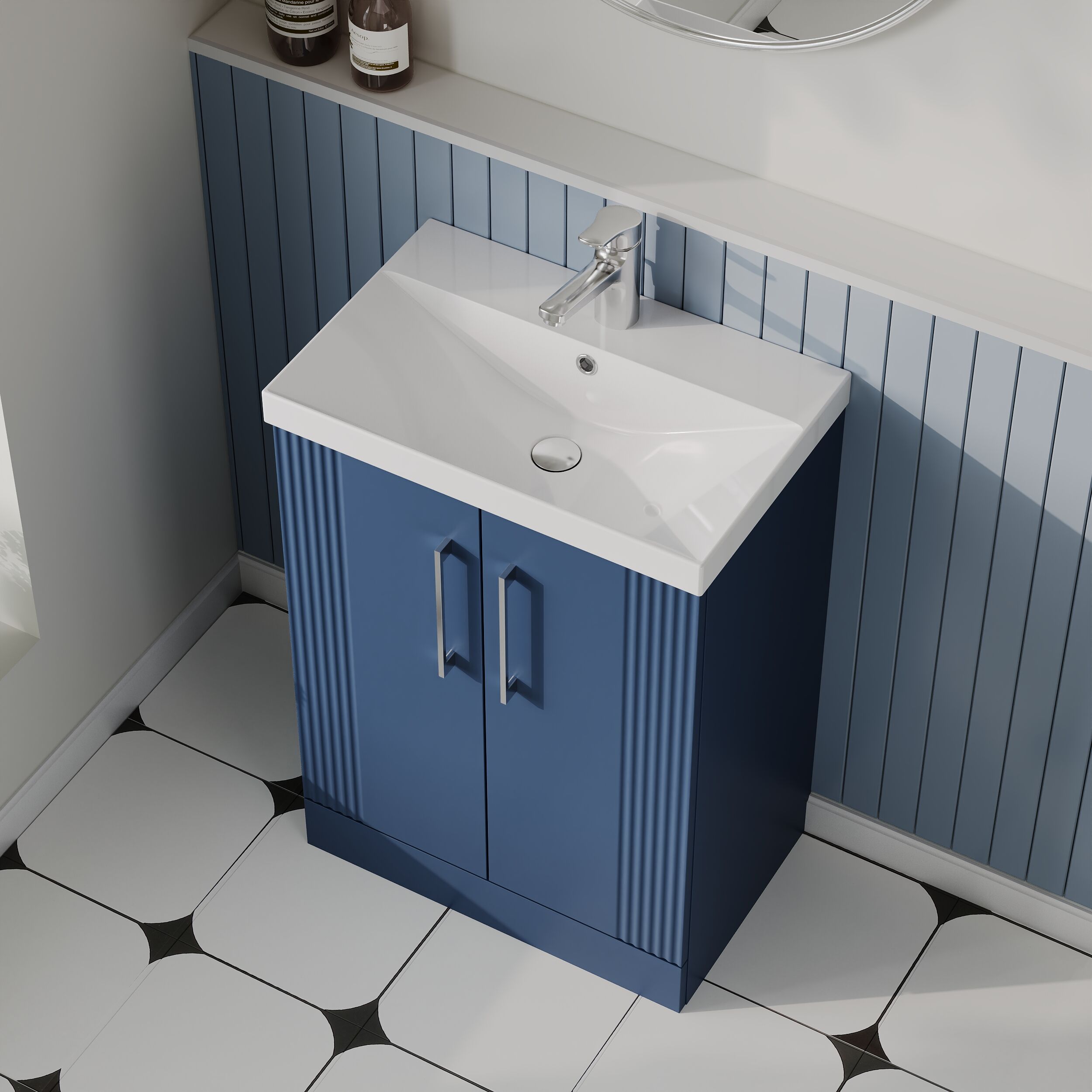 Nuie 600mm Satin Blue Fluted Floor Standing 2-Door Vanity Unit with Basin Including Chrome Handles