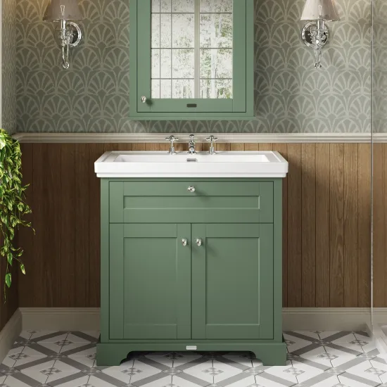 Hudson Reed Old London Floor Standing 2 Door Vanity Unit & 3 Tap Hole Fireclay Basin, 800mm - Hunter Green