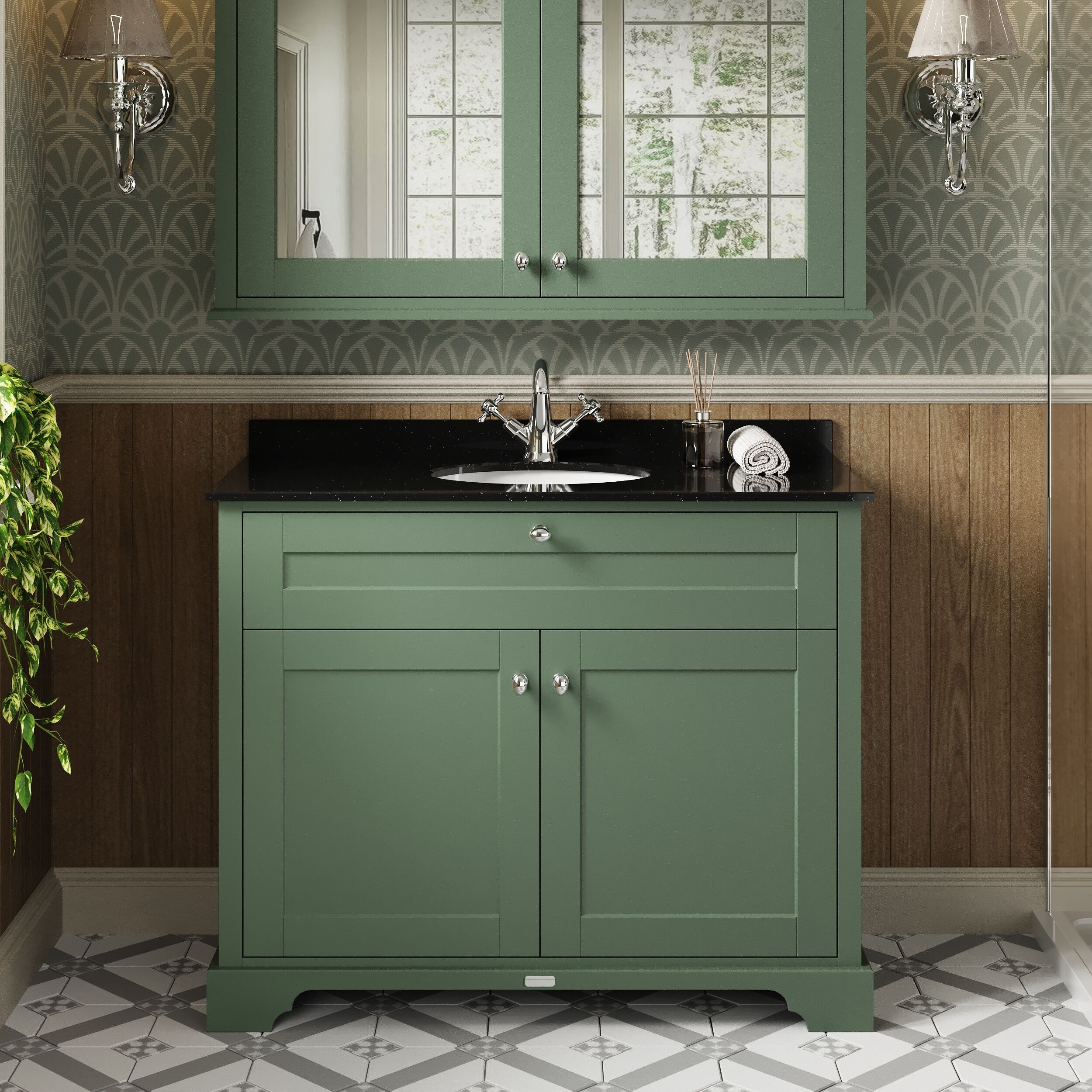 Hudson Reed Old London 1020mm Hunter Green Floor Standing 2 Door Vanity Unit With Black Marble Top Basin