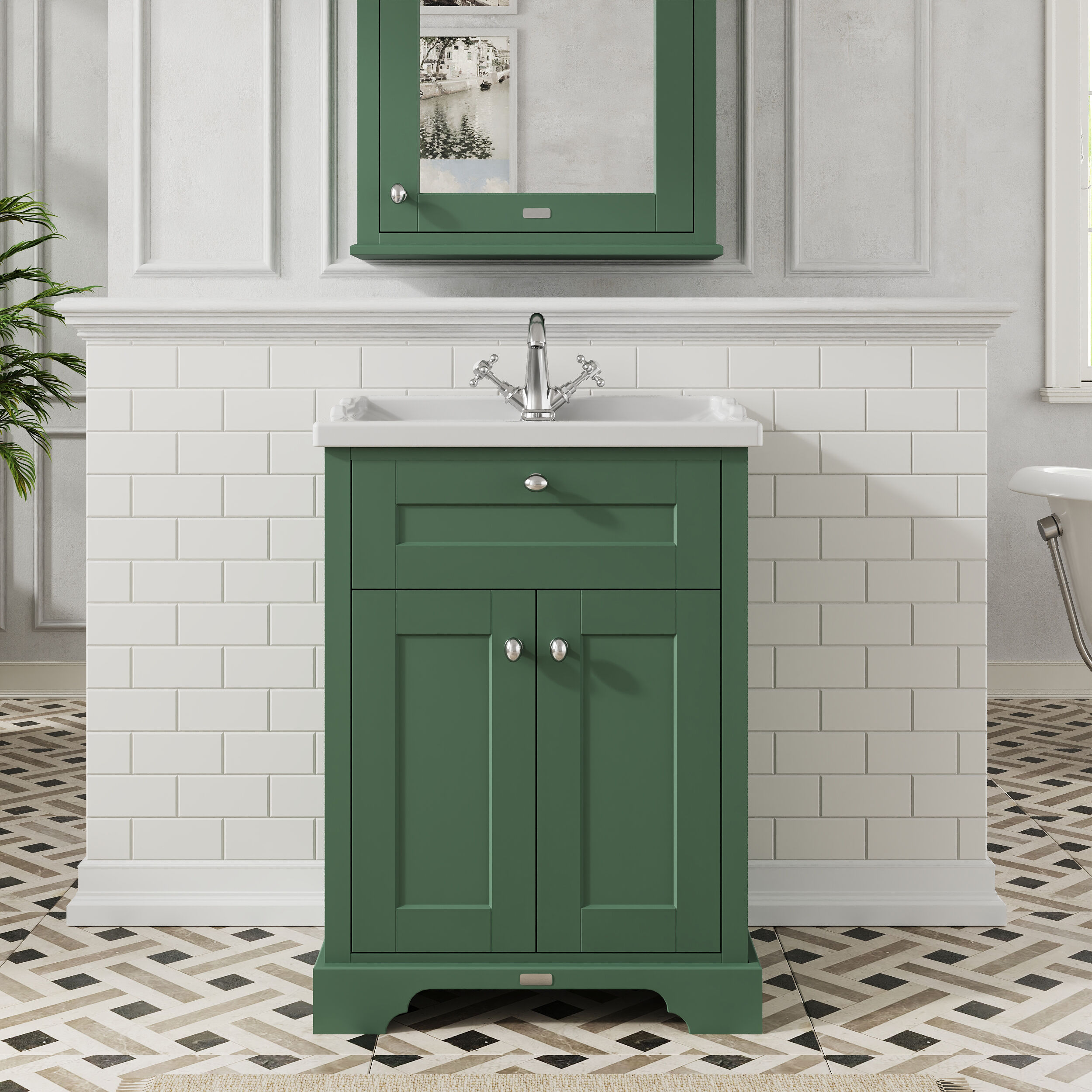 Hudson Reed Old London 600mm Hunter Green Floor Standing 2 Door Vanity Unit with 1 Tap Hole Ceramic Basin