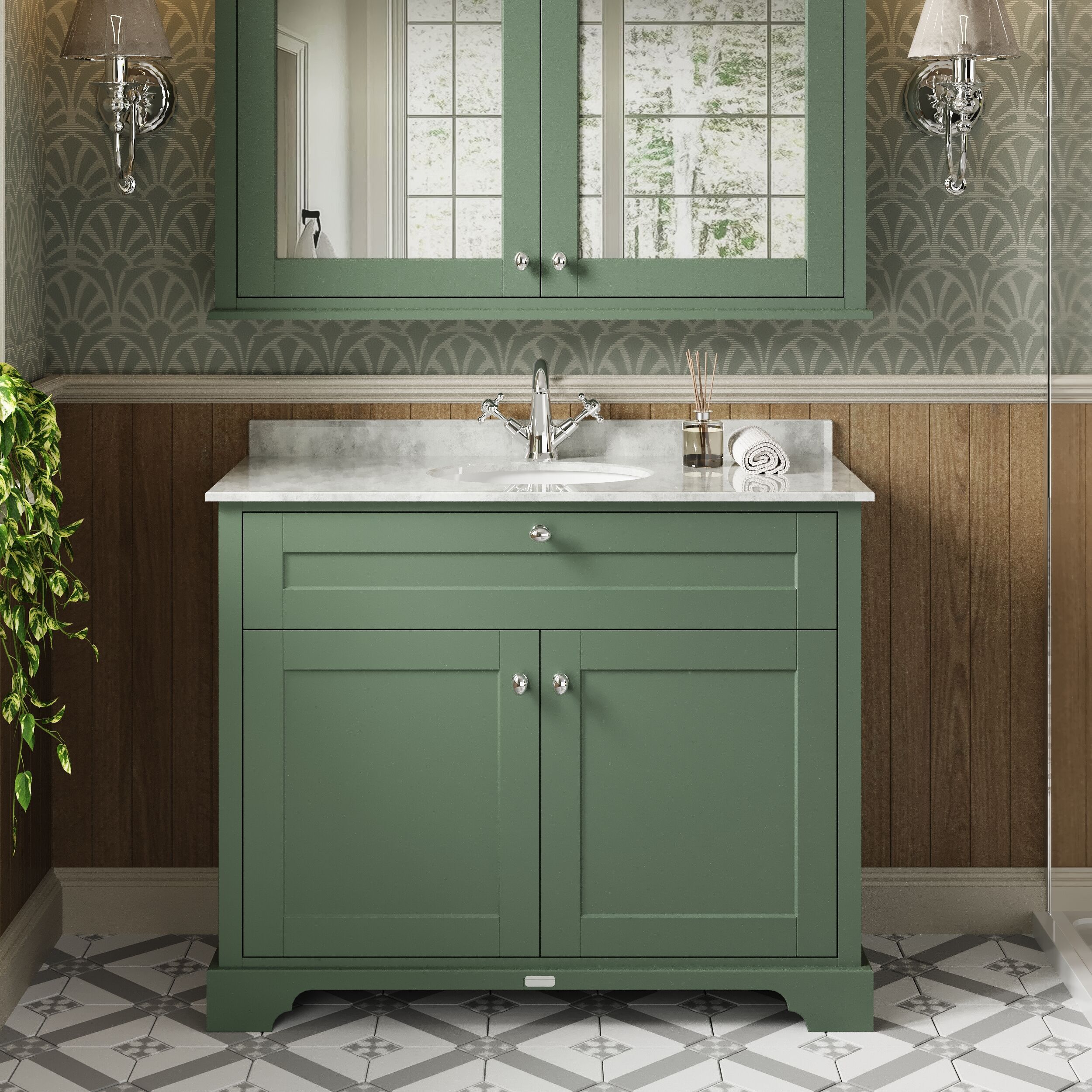 Hudson Reed Old London 1020mm Hunter Green Floor Standing 2 Door Vanity Unit With White Marble Top Basin