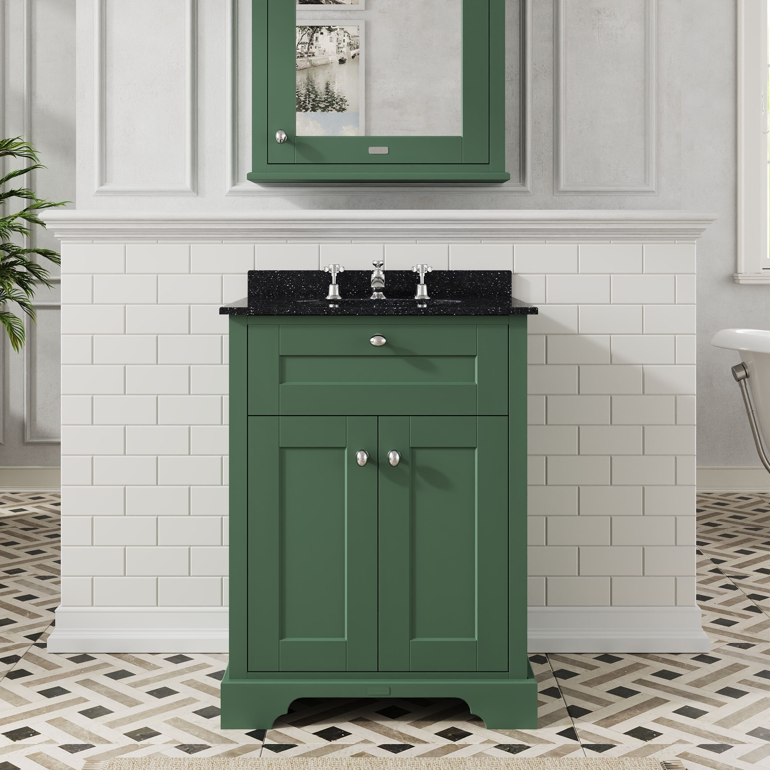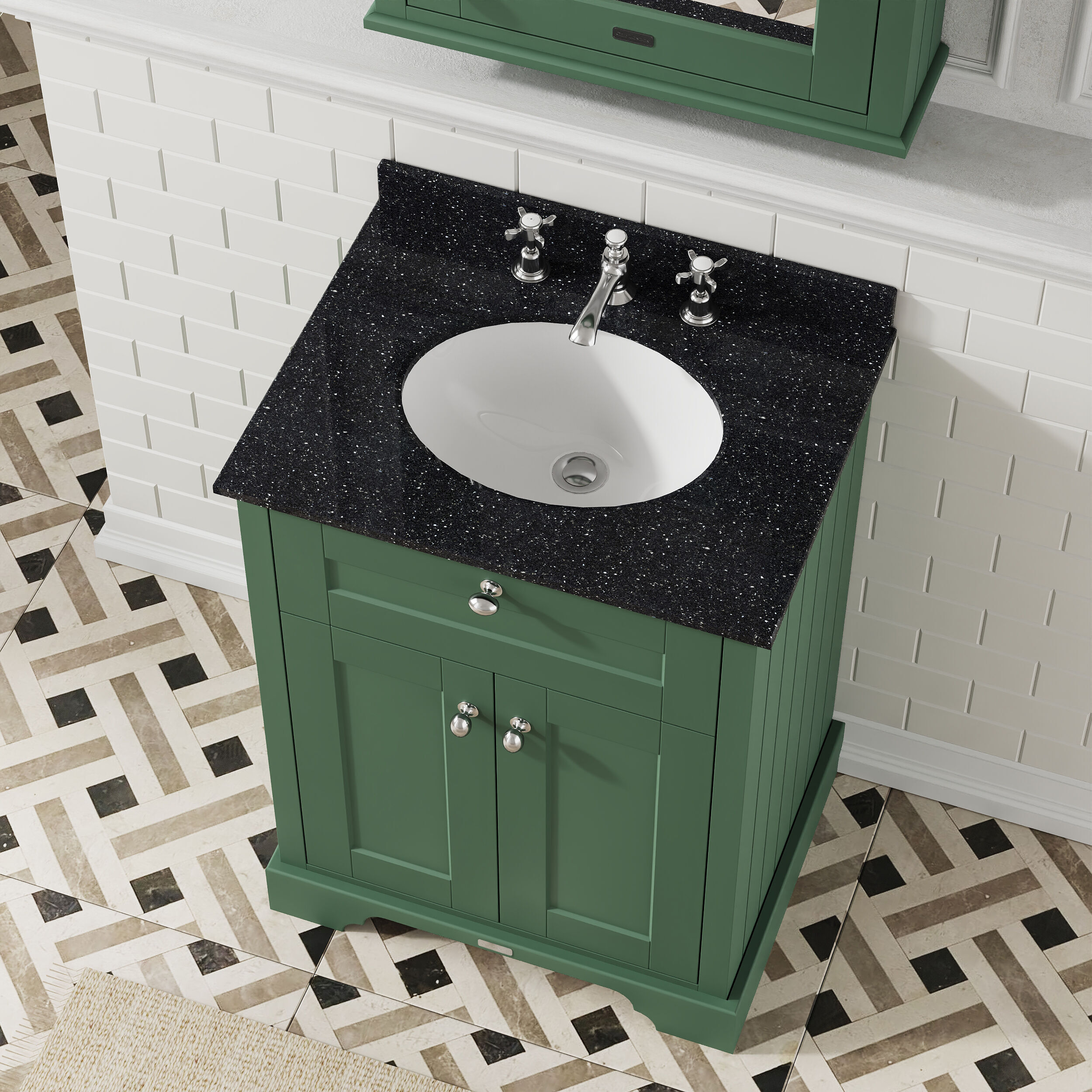 Old London Floor Standing 2 Door Vanity Unit with 3 Tap Hole Black Marble Top 600mm - Hunter Green