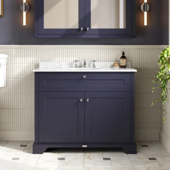 The striking finish of this Twilight blue unit will add contrast and impact to your traditional bathroom
