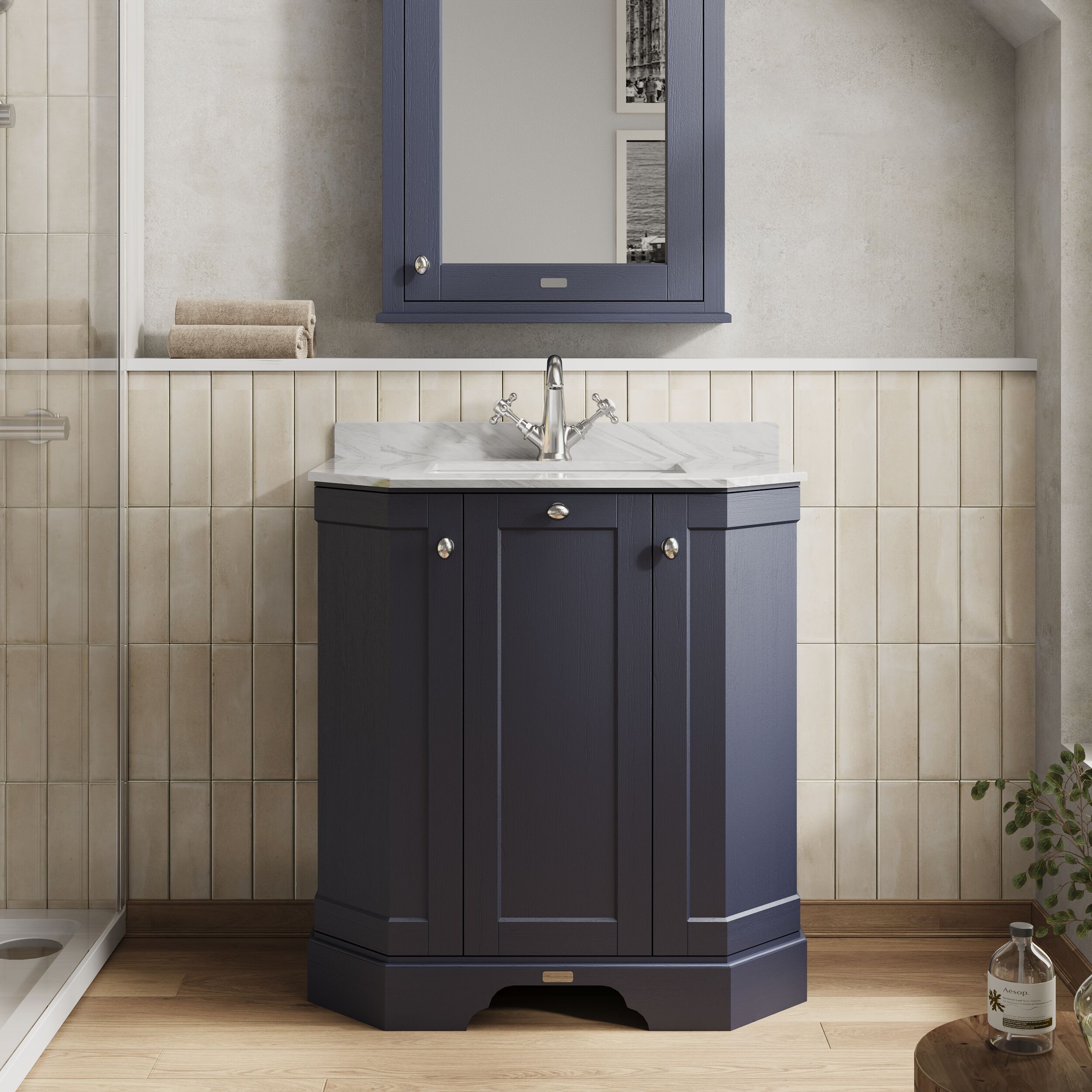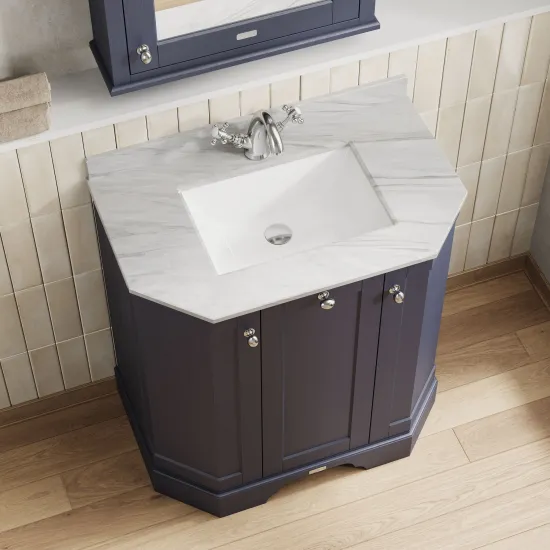 Old London Floor Standing 3 Door Angled Vanity Unit with 1 Tap Hole Grey Marble Top 750mm - Twilight Blue