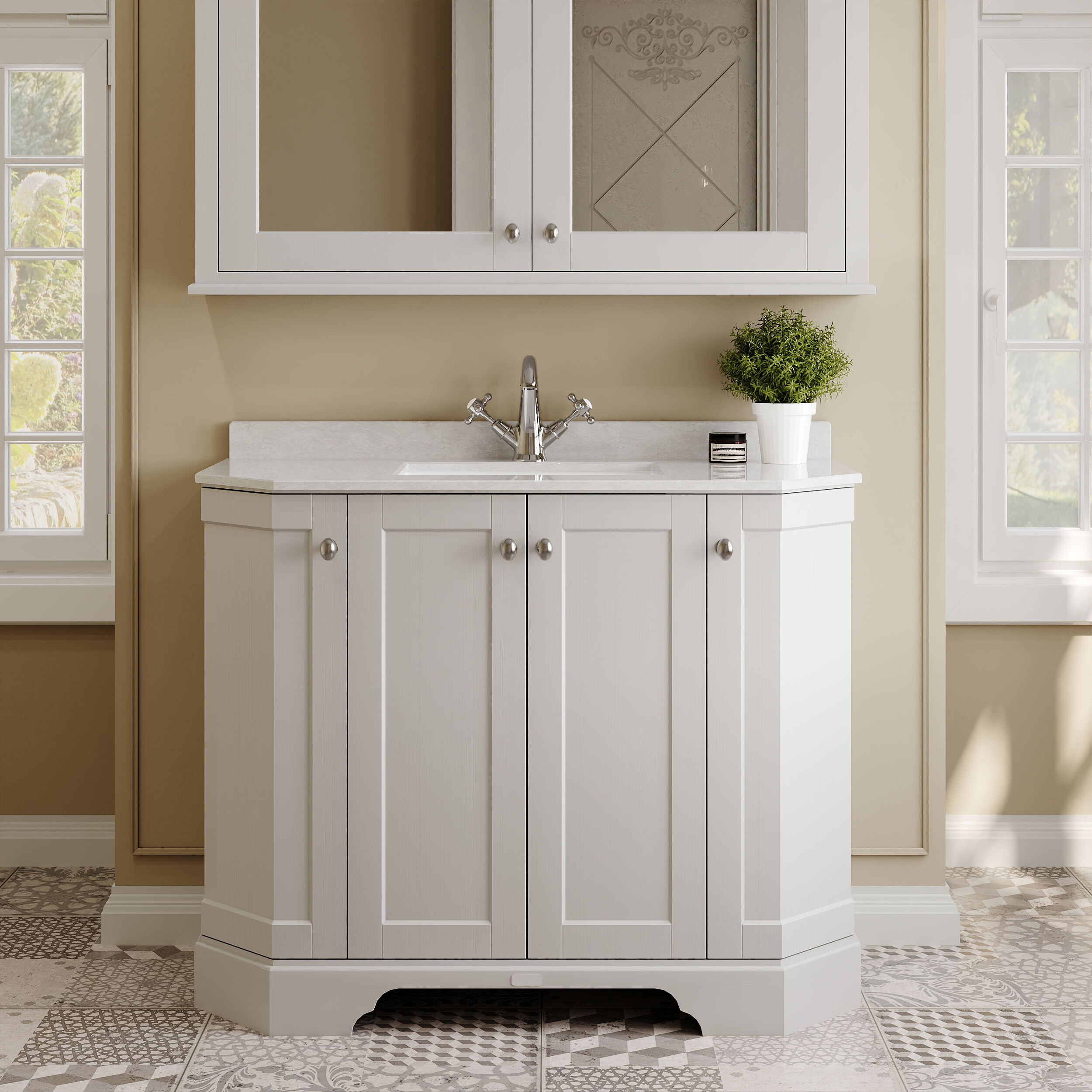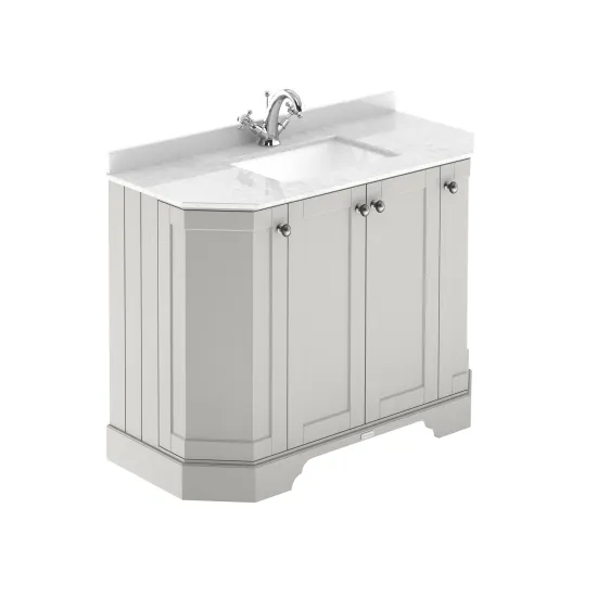 Old London Floor Standing 4 Door Angled Vanity Unit with 1 Tap Hole White Marble Top 1000mm - Timeless Sand