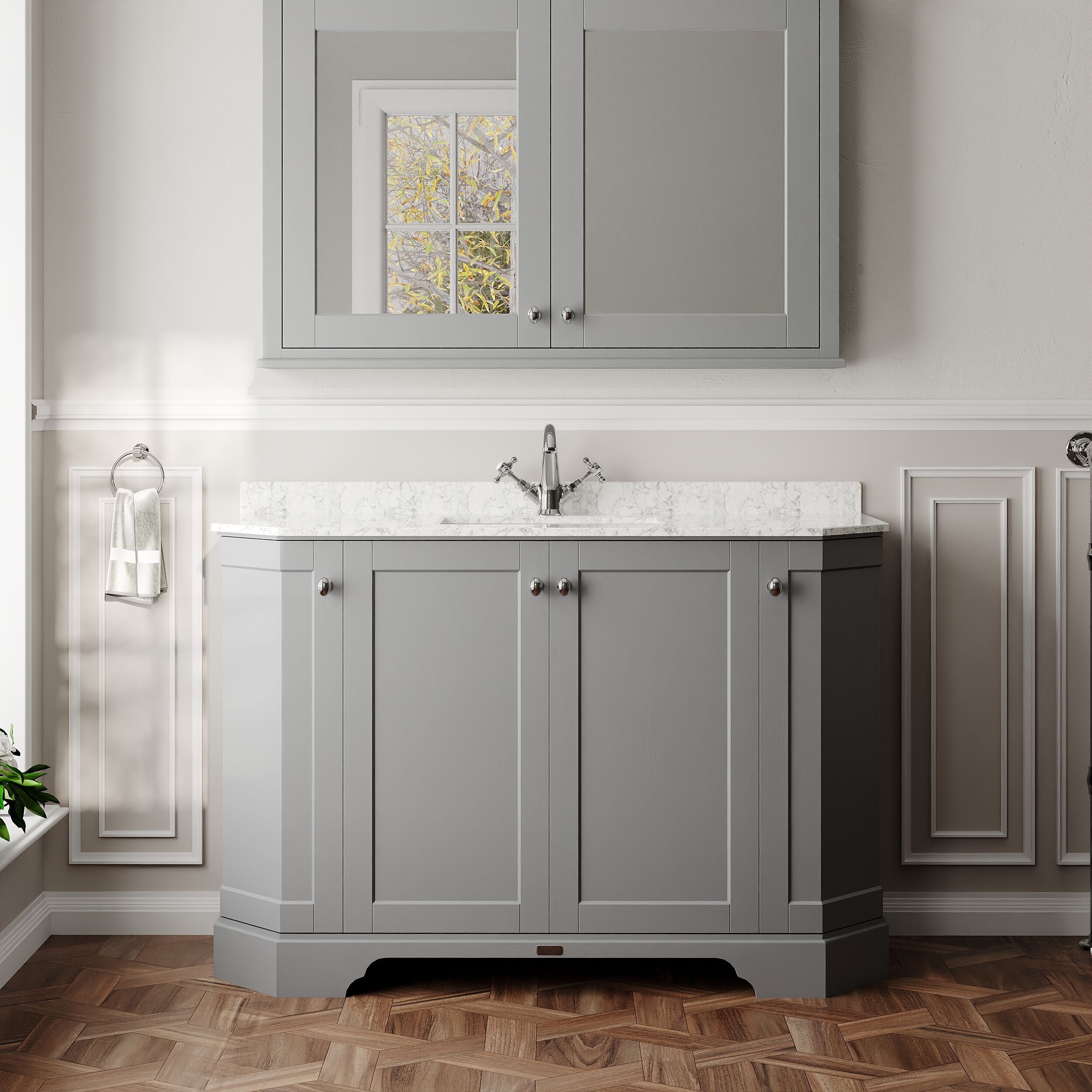 Hudson Reed Old London 1220mm Storm Grey Floor Standing 4 Door Vanity Unit With White Marble Double Basin