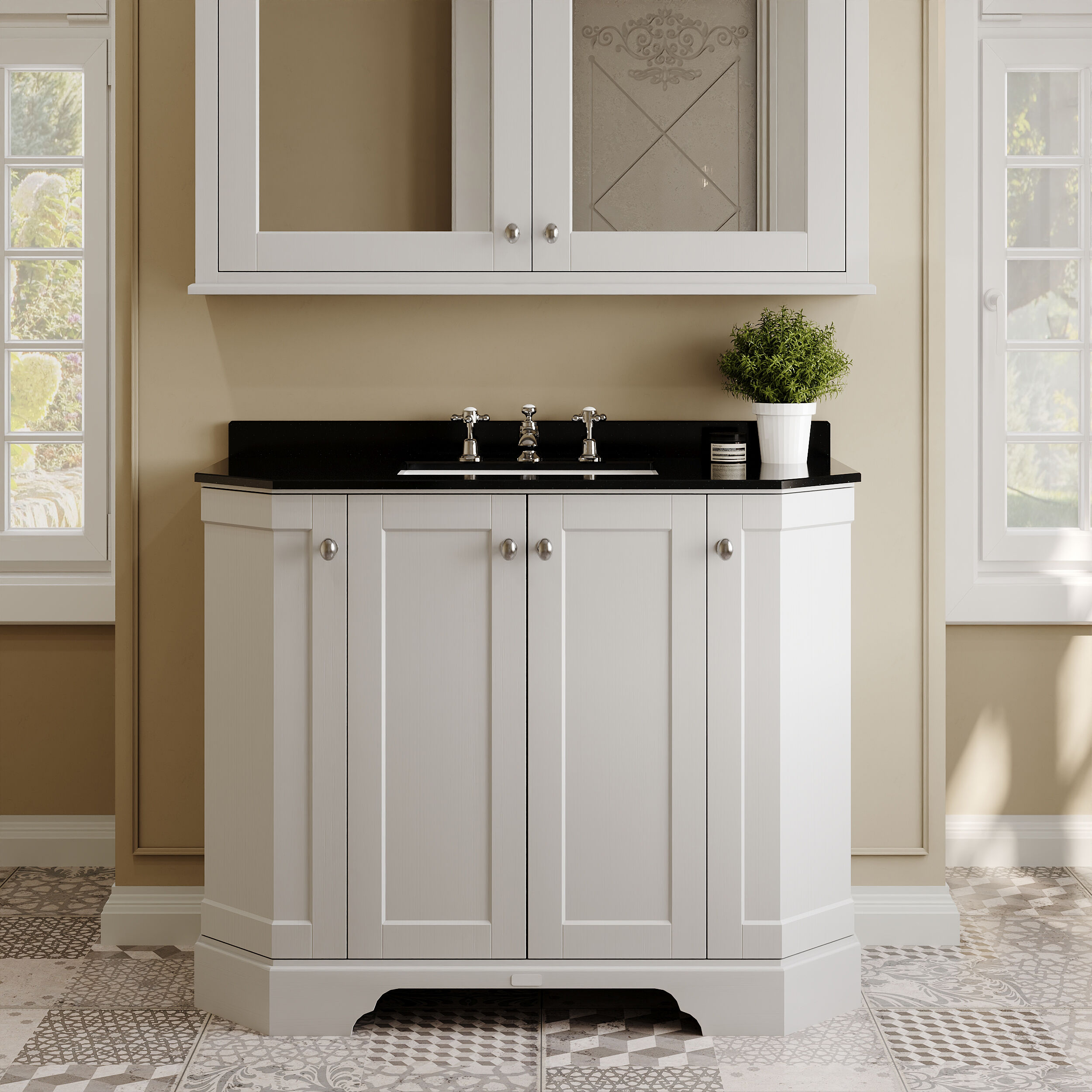Old London Floor Standing 4 Door Angled Vanity Unit with 3 Tap Hole Black Marble Top 1000mm - Timeless Sand