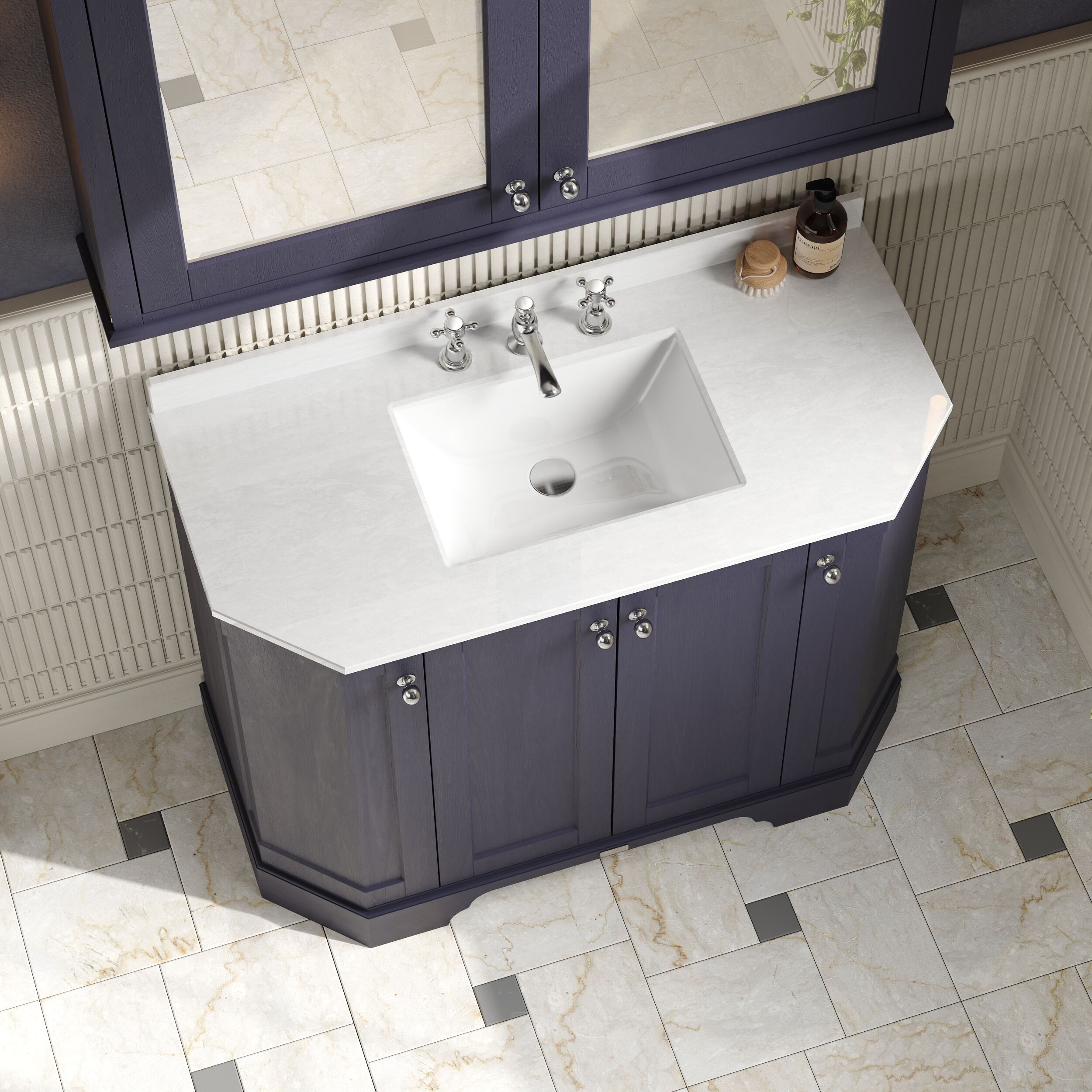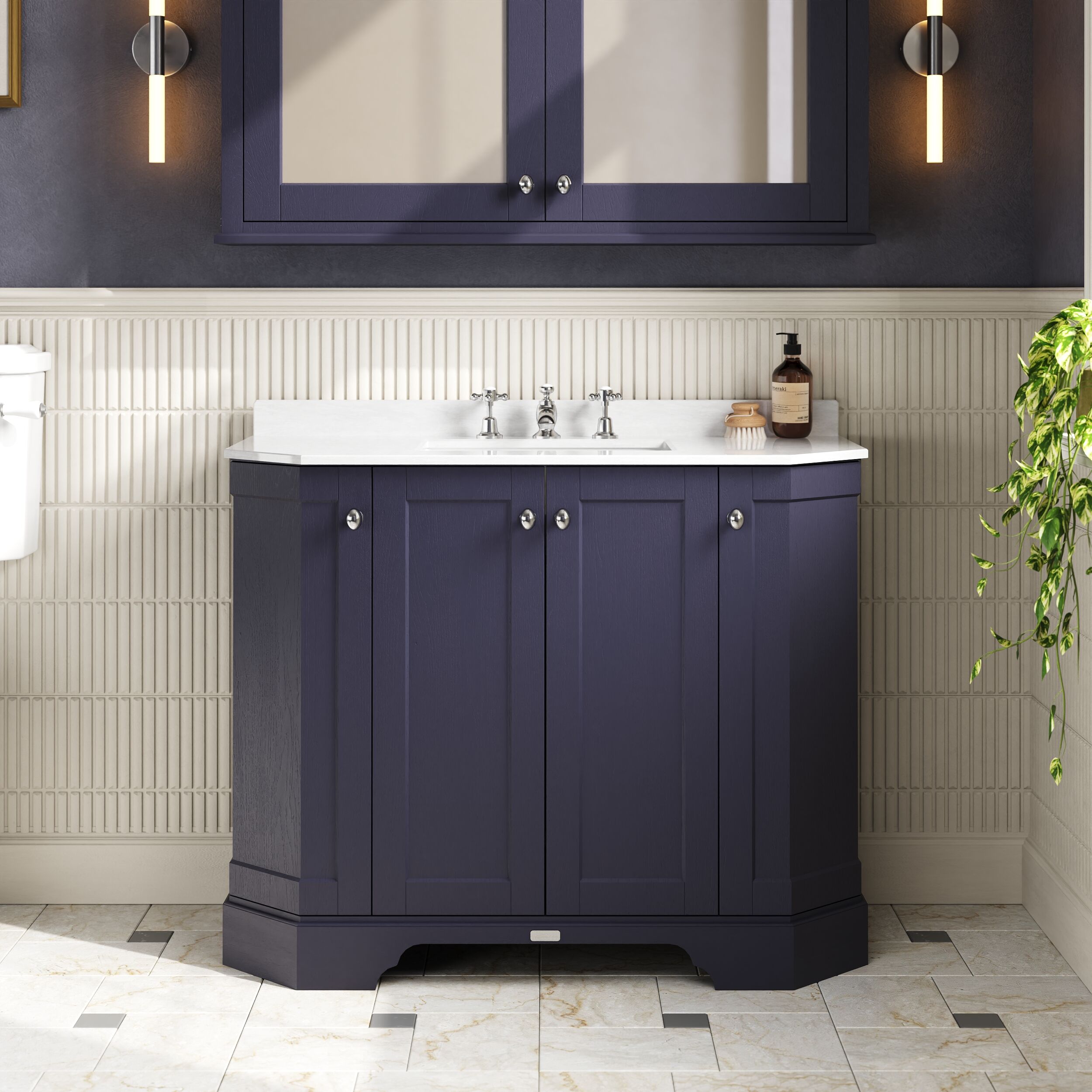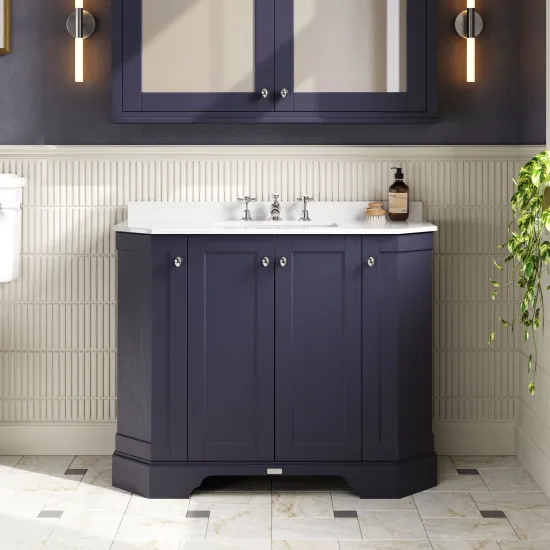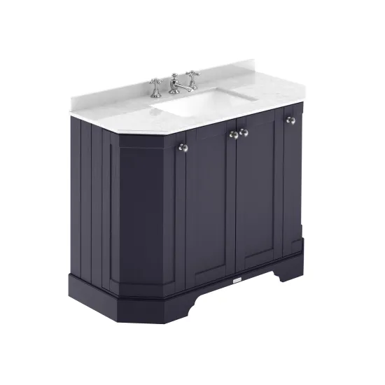 Old London Floor Standing 4 Door Angled Vanity Unit with 3 Tap Hole White Marble Top 1000mm - Twilight Blue