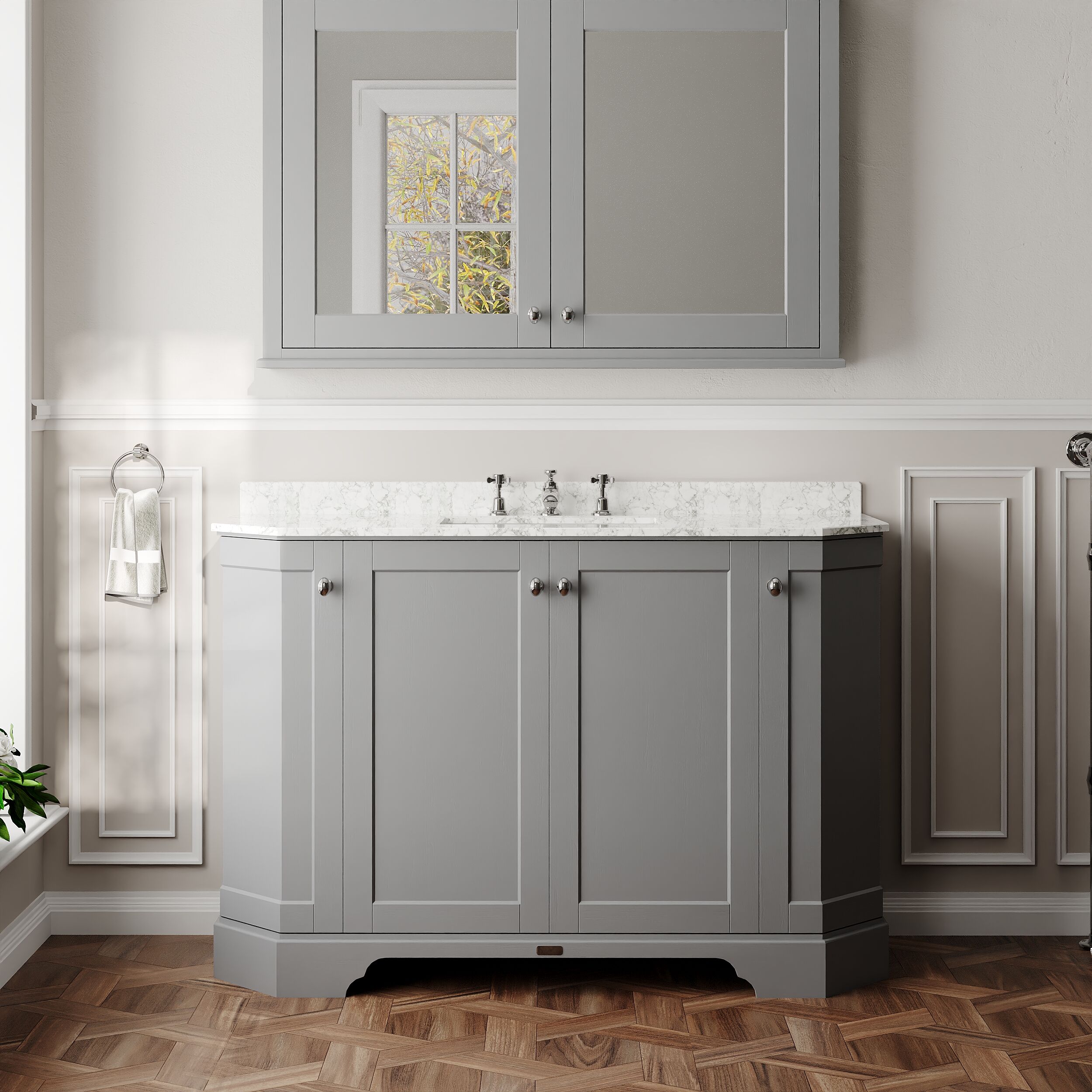 Hudson Reed Old London 1220mm Storm Grey Floor Standing 4 Door Vanity Unit with White Marble Top Double Basin