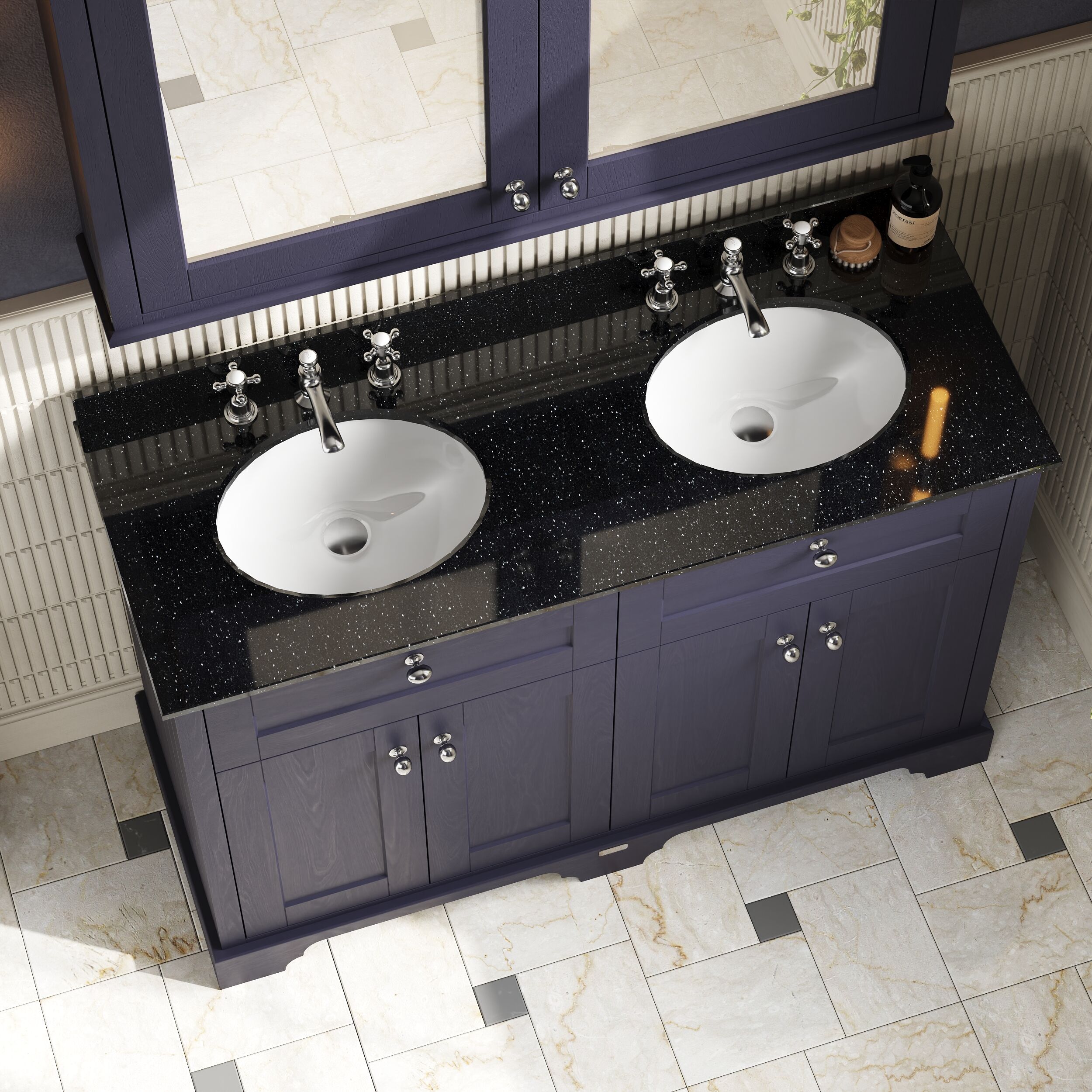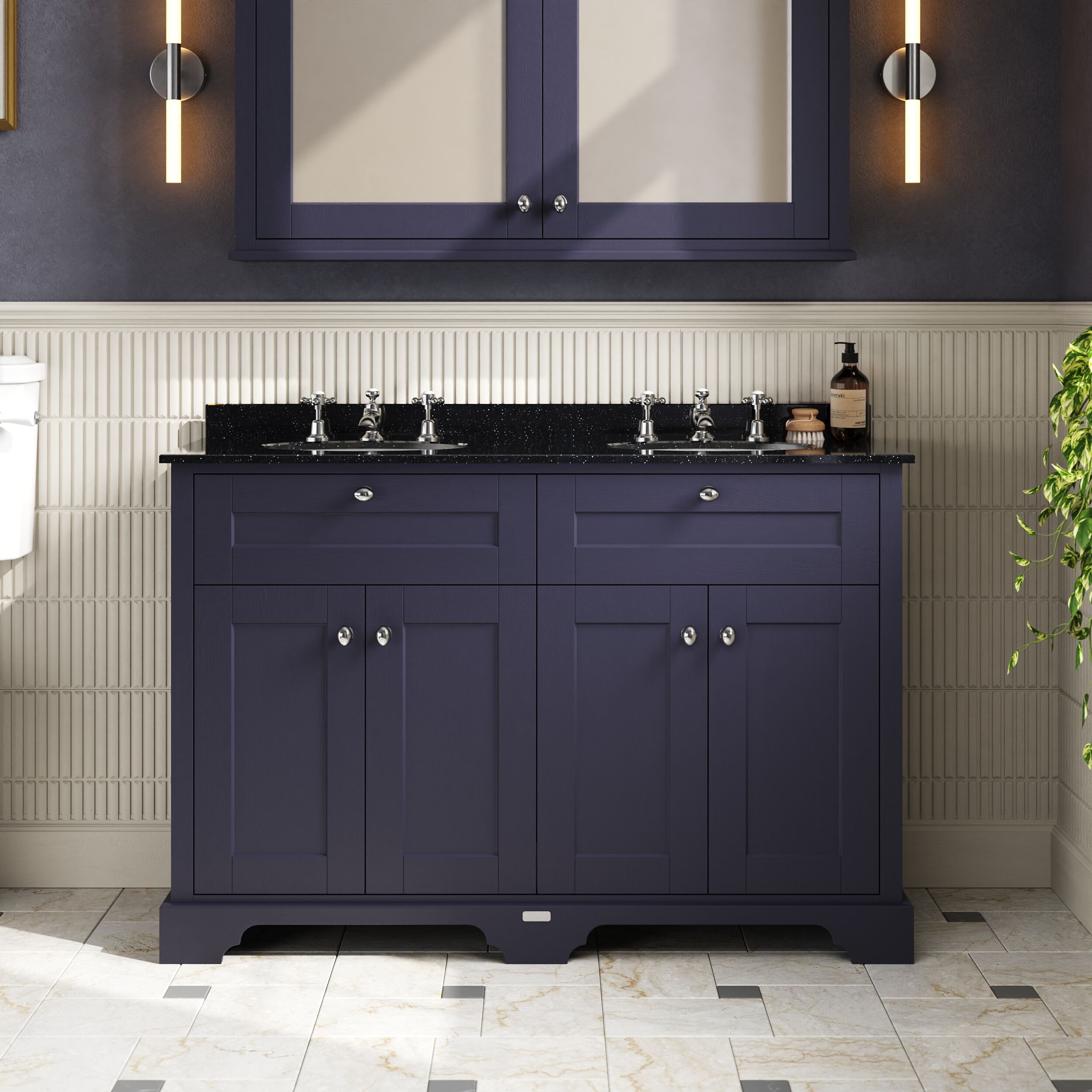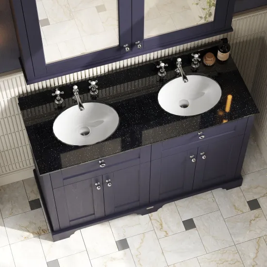 Old London Floor Standing 4 Door Vanity Unit with 3 Tap Hole Double Basin Black Marble Top 1200mm - Twilight Blue