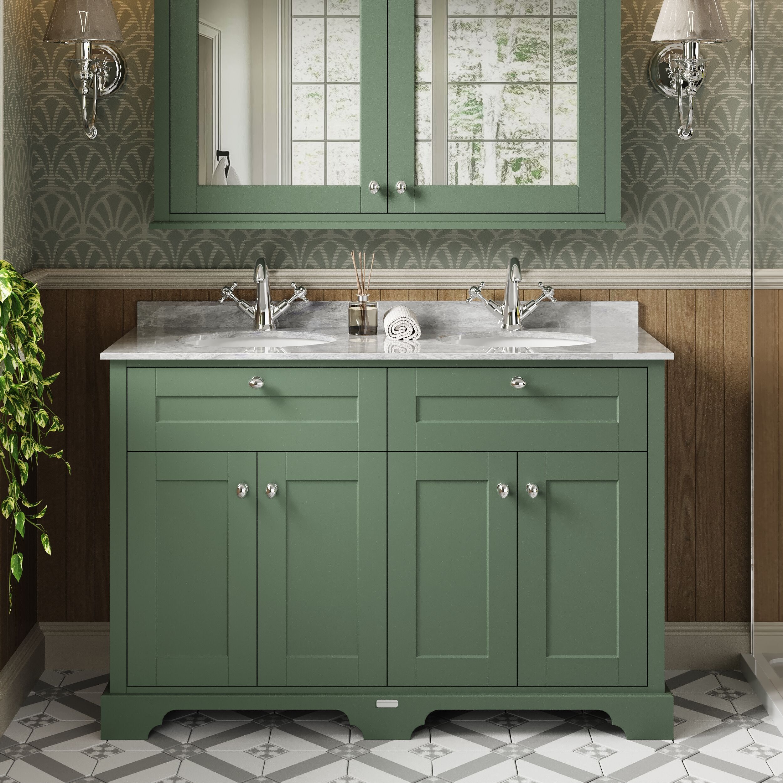Hudson Reed Old London 1200mm Hunter Green Floor Standing 4 Door Vanity Unit With Grey Marble Top Double Basin