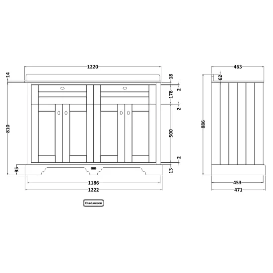 Old London Floor Standing 4 Door Vanity Unit with Double 1 Tap Hole Basin Grey Marble Top 1200mm - Hunter Green