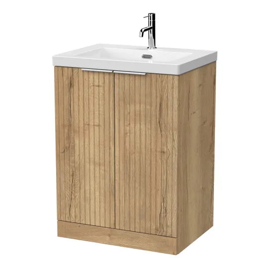 nuie Lux Flume 600mm 2-Door Floor Standing Unit with Contemporary Fireclay Basin - 1 Tap Hole - Autumn Oak