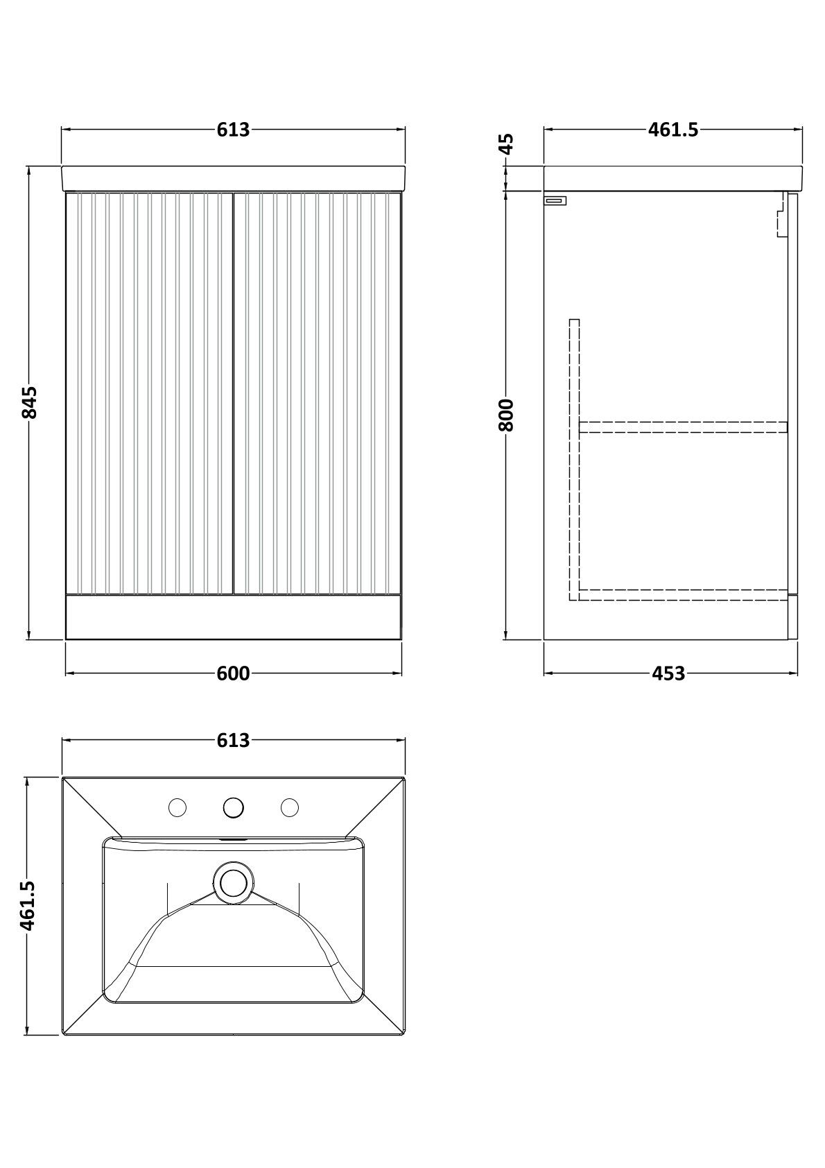 Flume 600mm 2-Door Floor Standing Unit with Contemporary Fireclay Basin - 3 Tap Holes