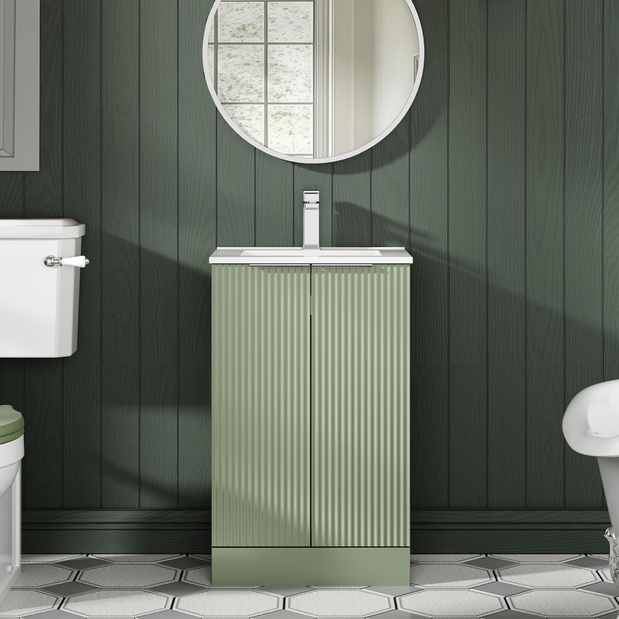 Hudson Reed Fluted 500mm Floor Standing 2-Door Vanity and Minimalist Basin - Satin Green