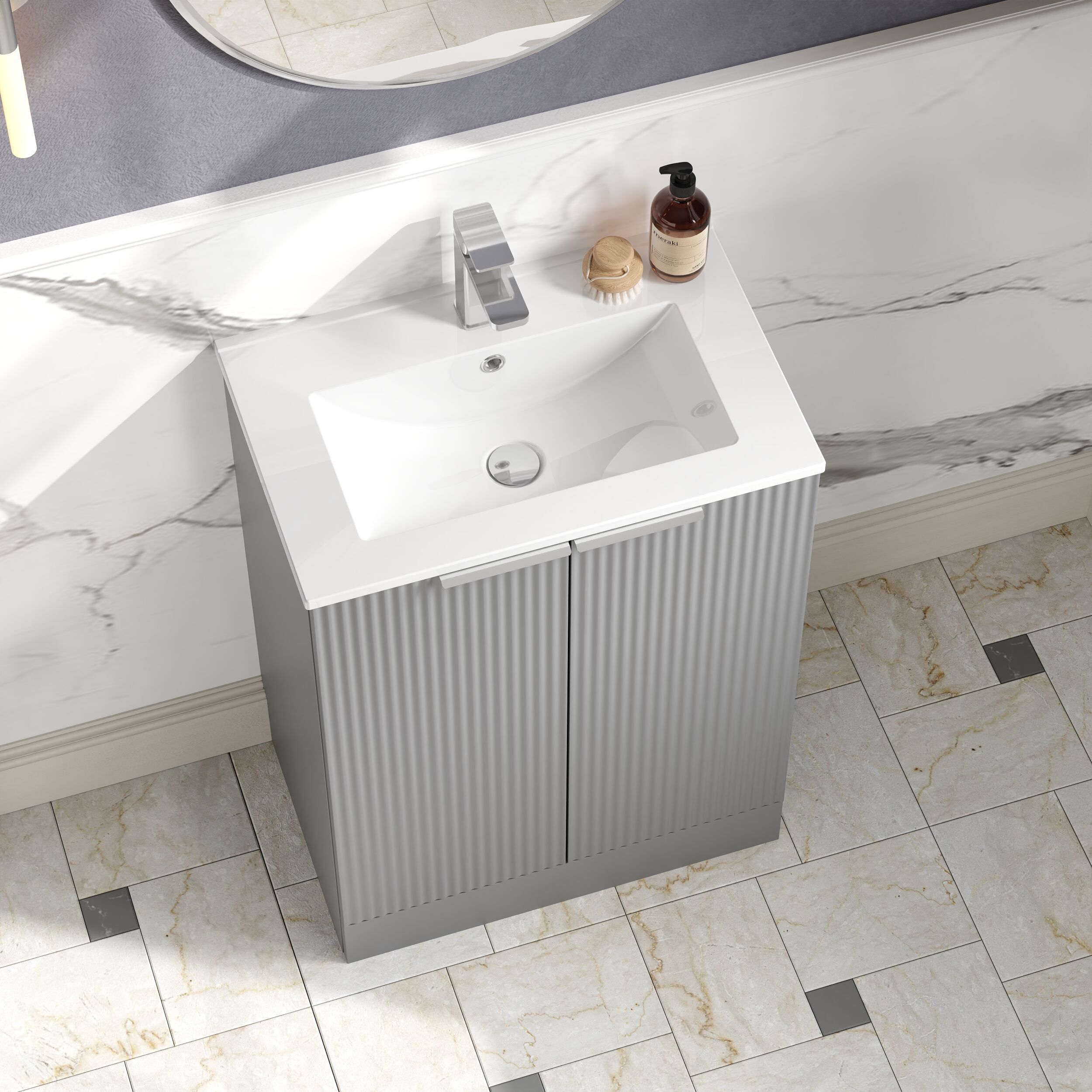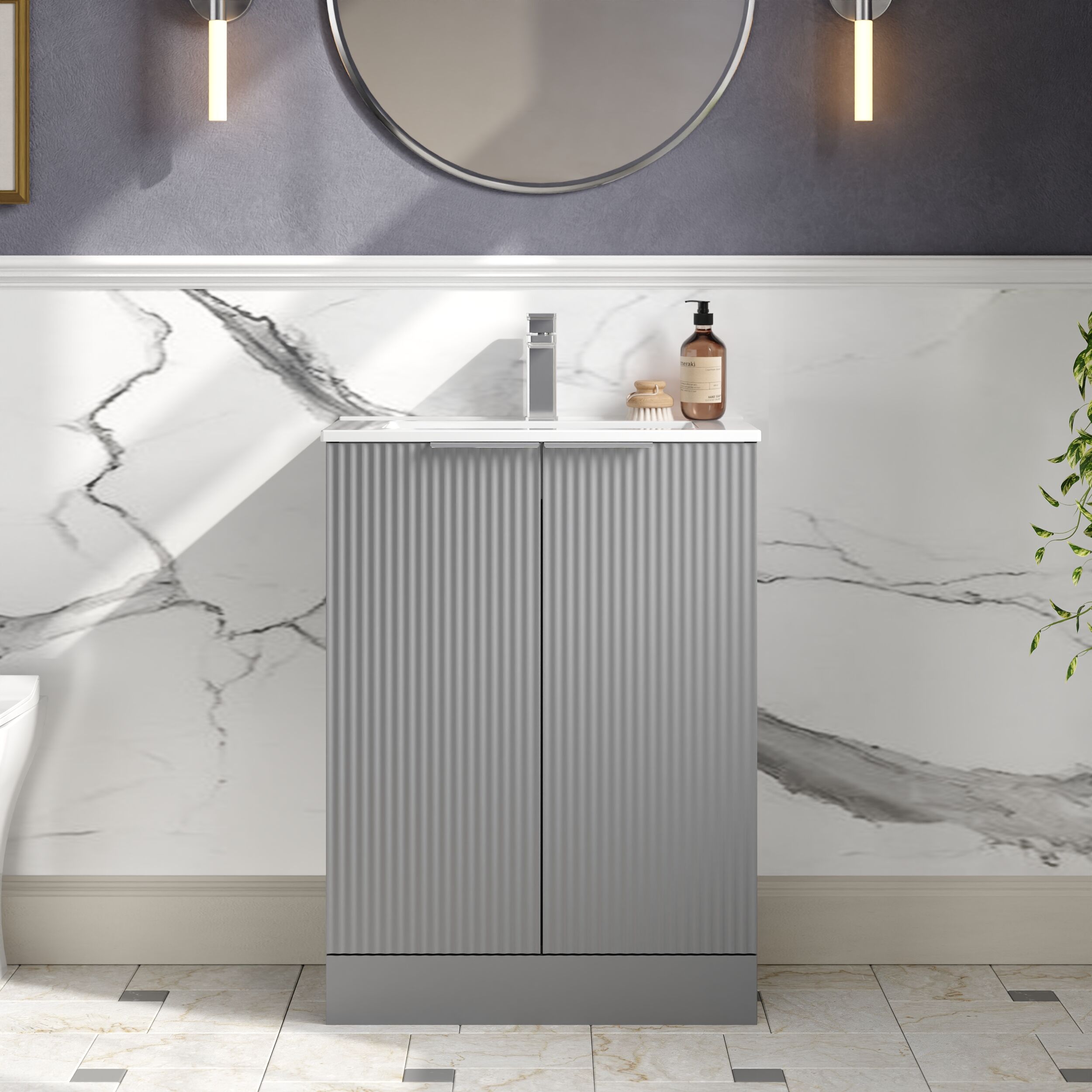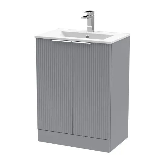 Hudson Reed Fluted 600mm Floor Standing 2-Door Vanity and Minimalist Basin - Satin Grey