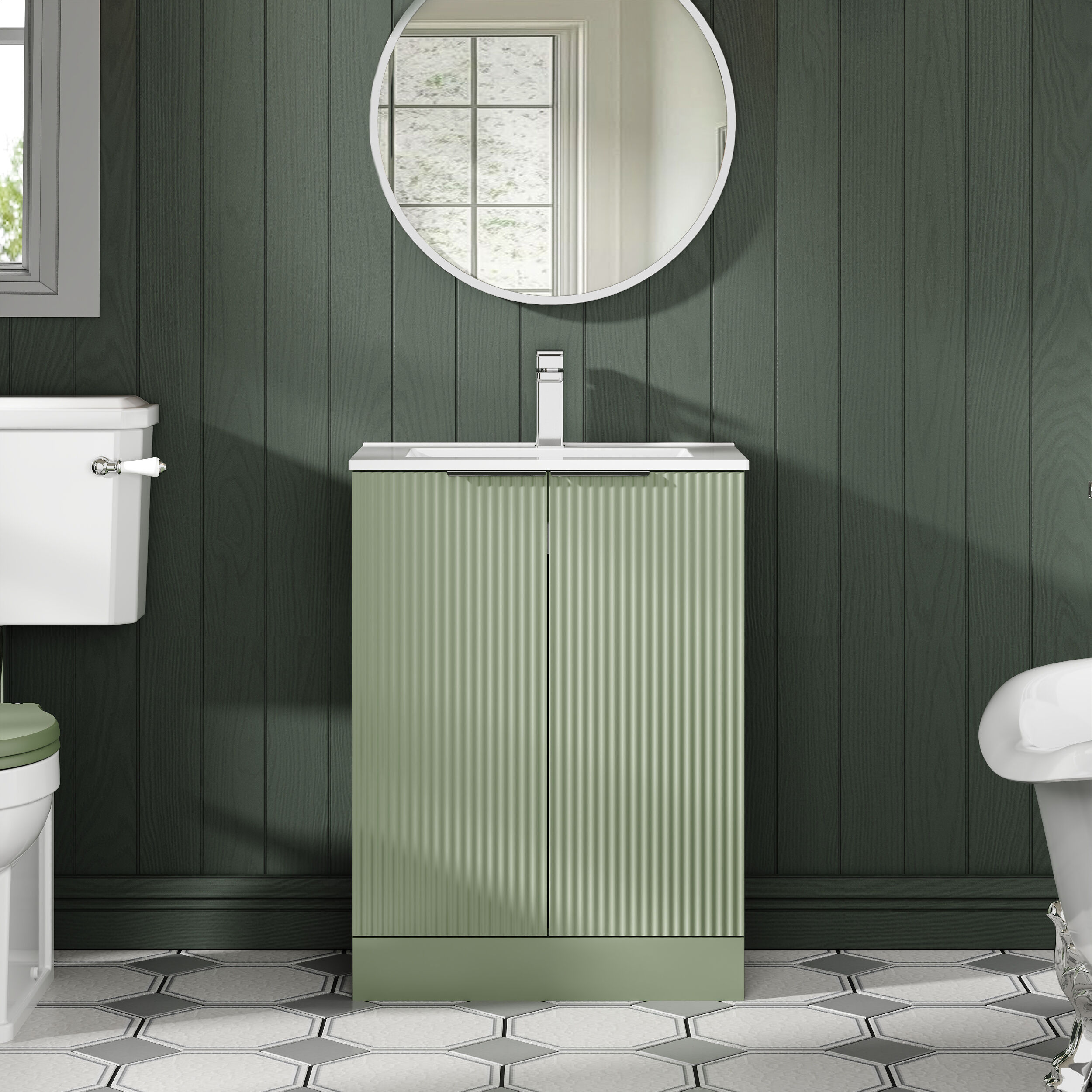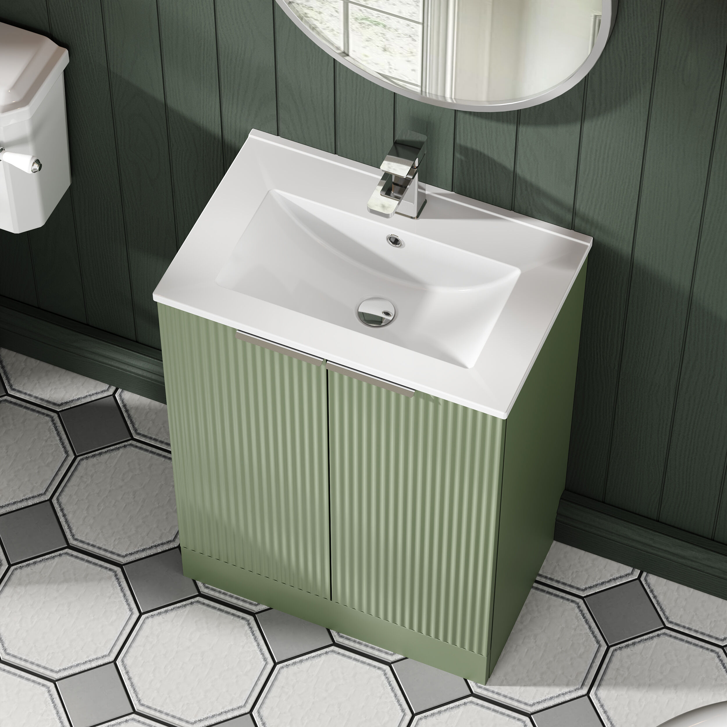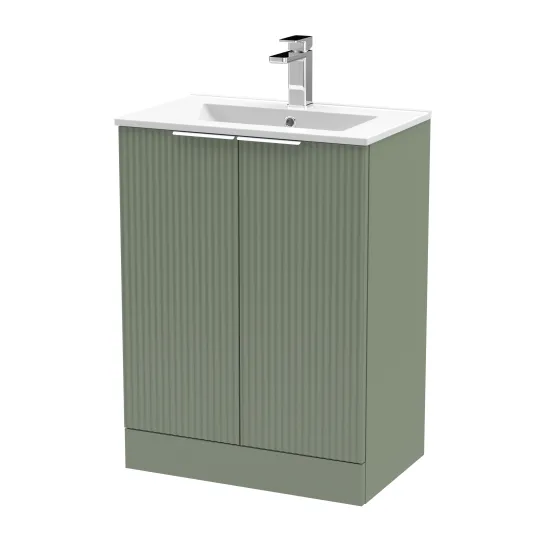 Hudson Reed Fluted 600mm Satin Green Floor Standing 2-Door Vanity Unit With Basin