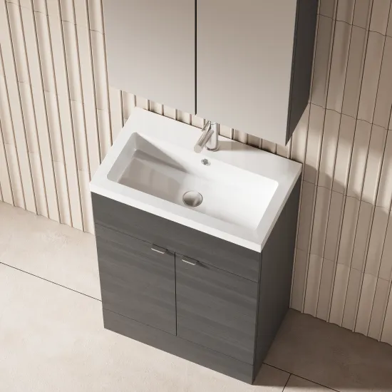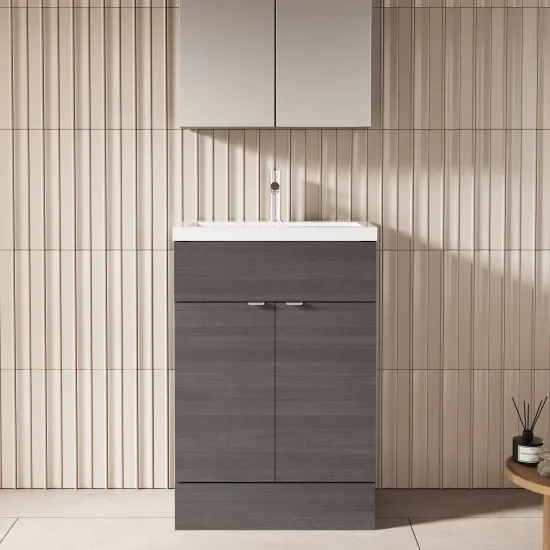Hudson Reed Fusion Floor Standing 2 Door Vanity Unit & Polymarble Basin 600mm - Anthracite Woodgrain
