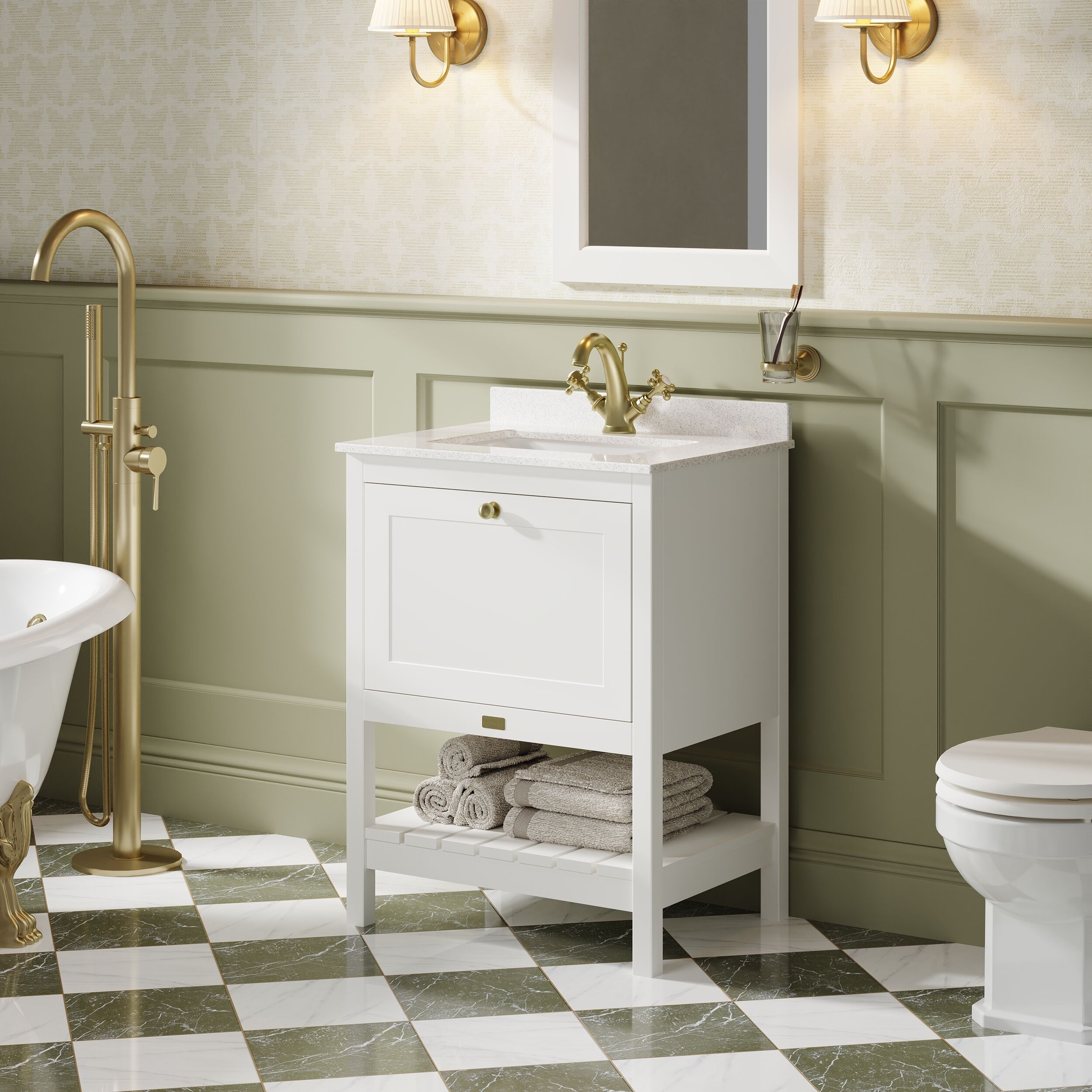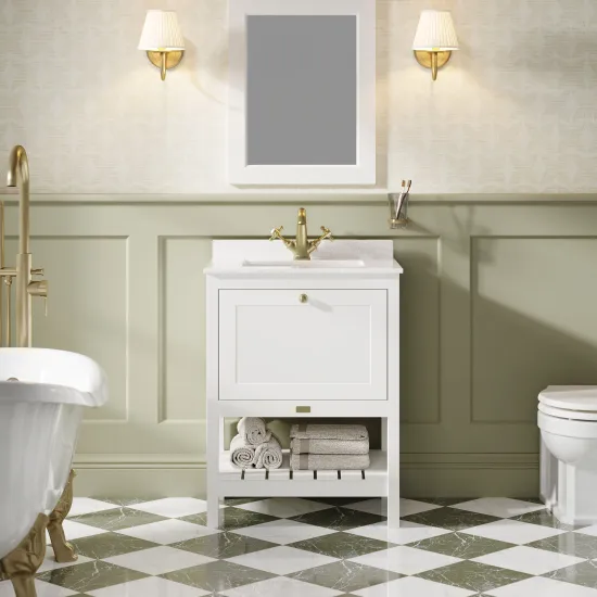Bayswater Hartleigh 600mm Pointing White 1 Drawer Floor Standing Vanity Unit With 1 Tap Hole Marble Top Basin