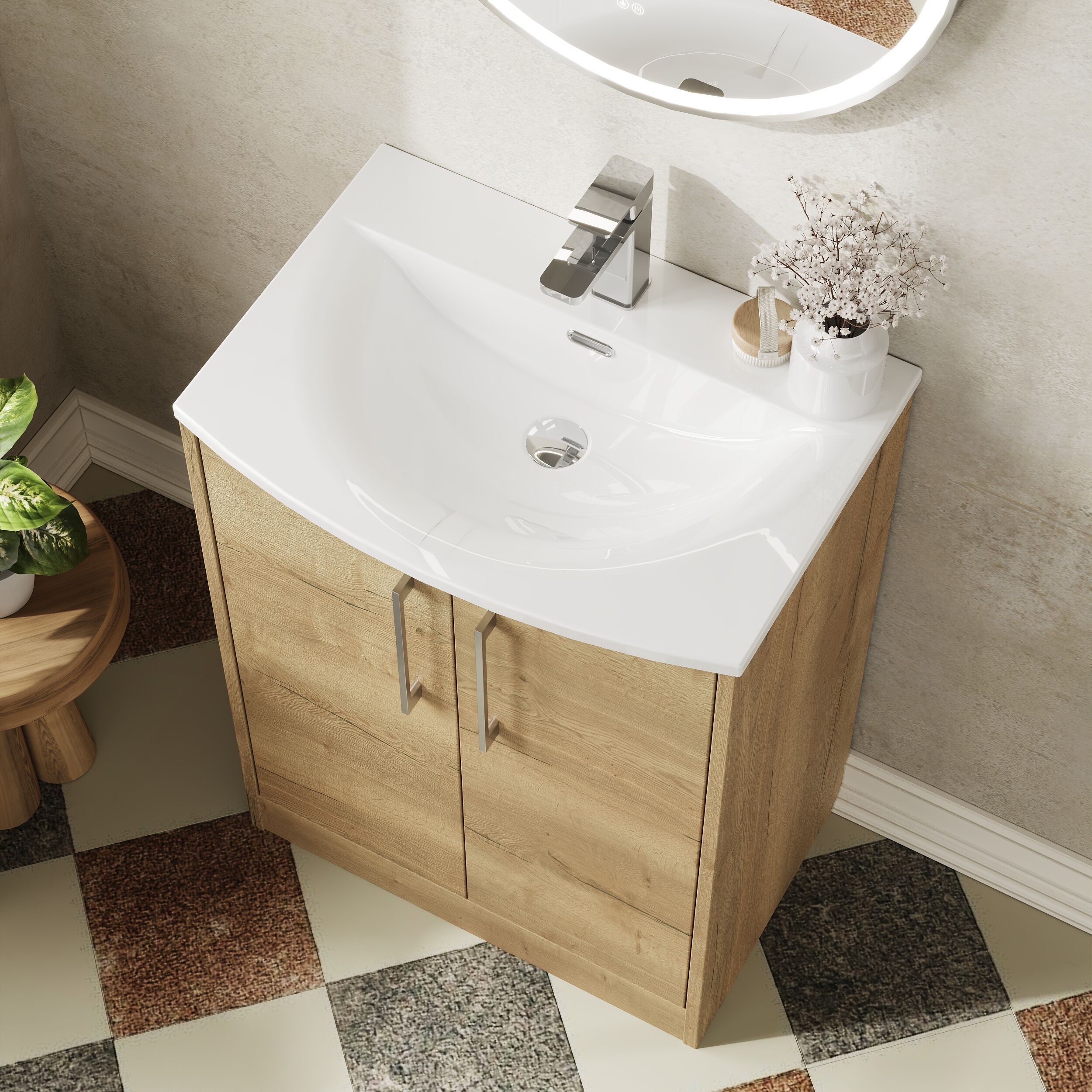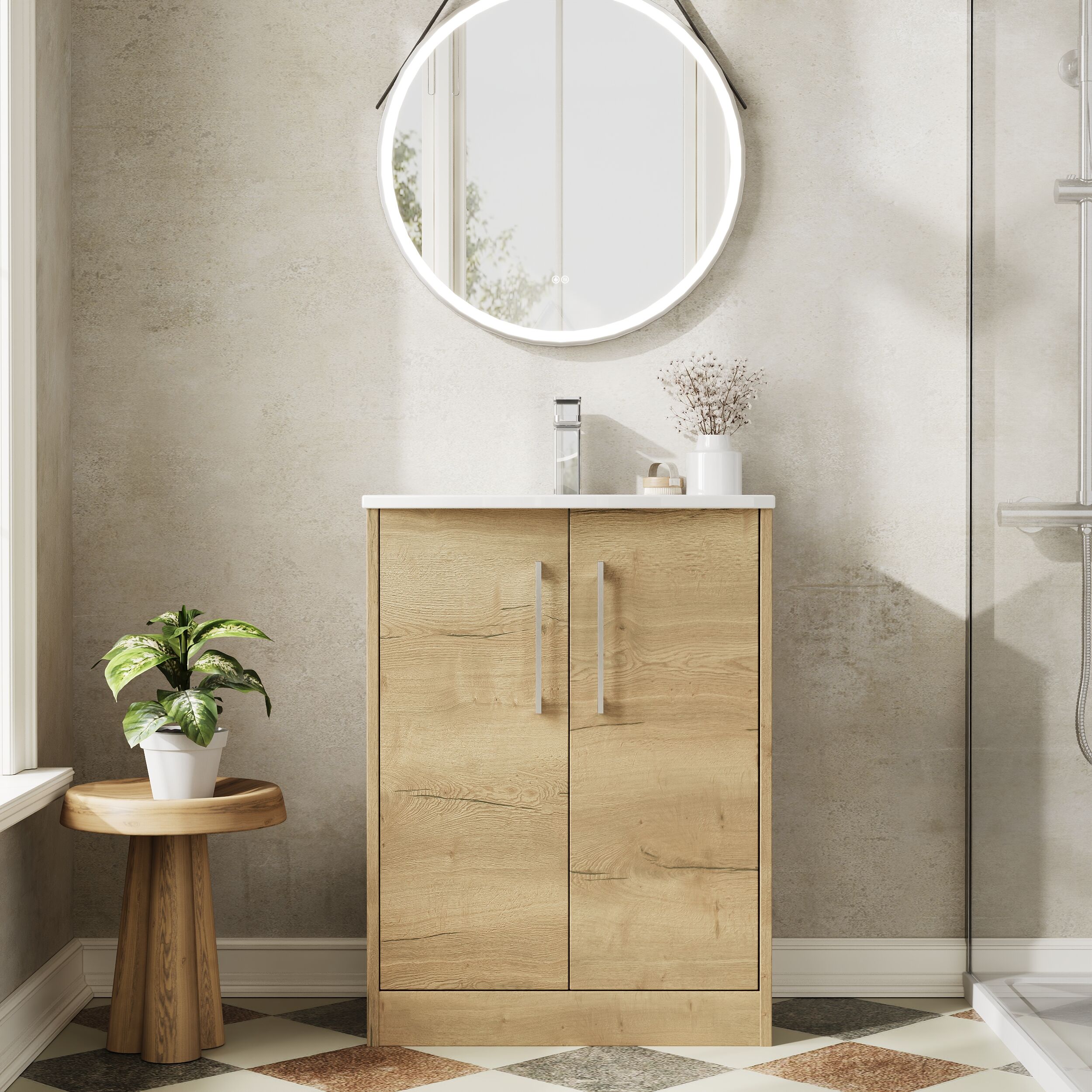 Hudson Reed Juno 600mm Floor Standing 2-Door Vanity & Curved 1 Tap Hole Basin - Autumn Oak