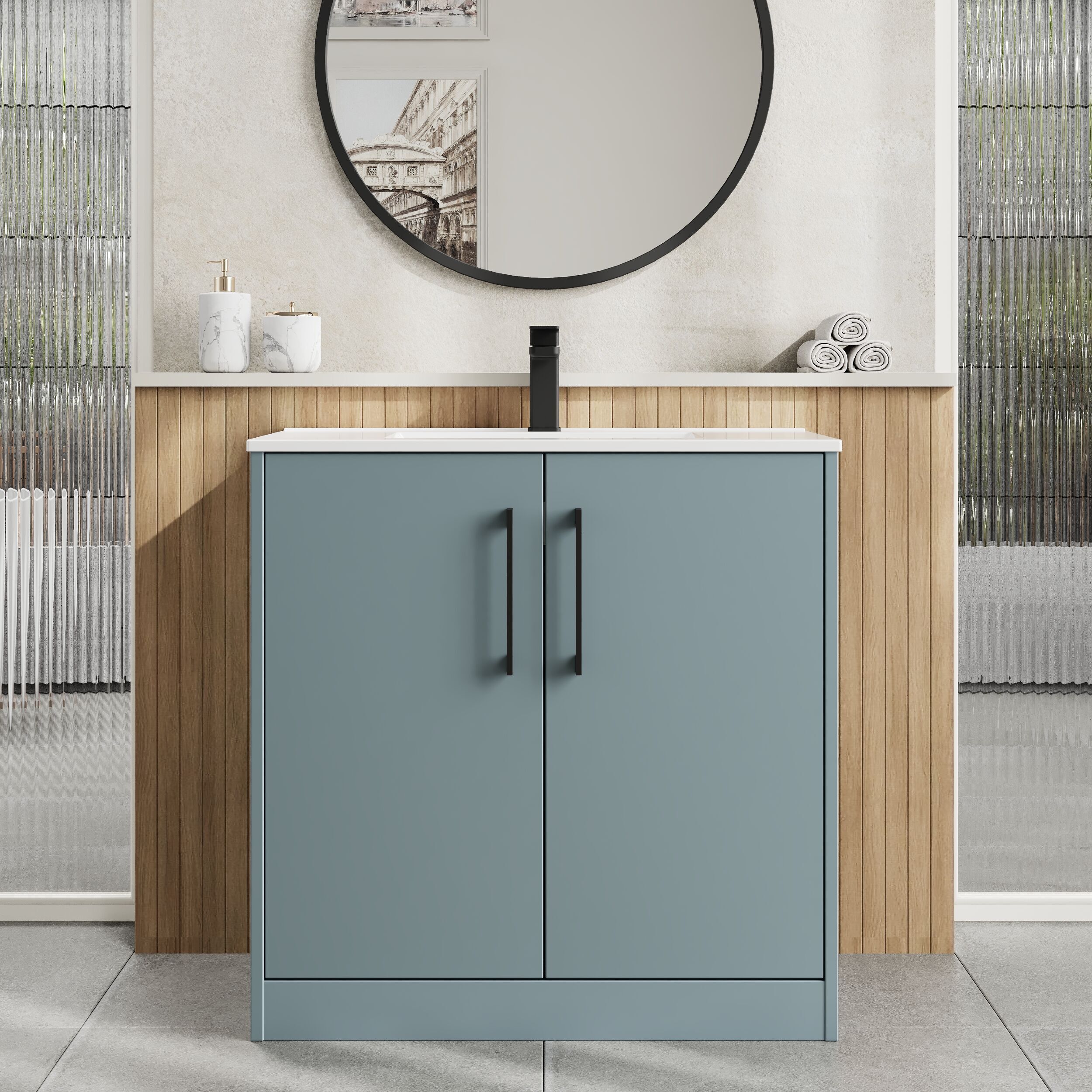 Contemporary floor-standing design provides ample storage for all your bathroom toiletries and cleaning supplies