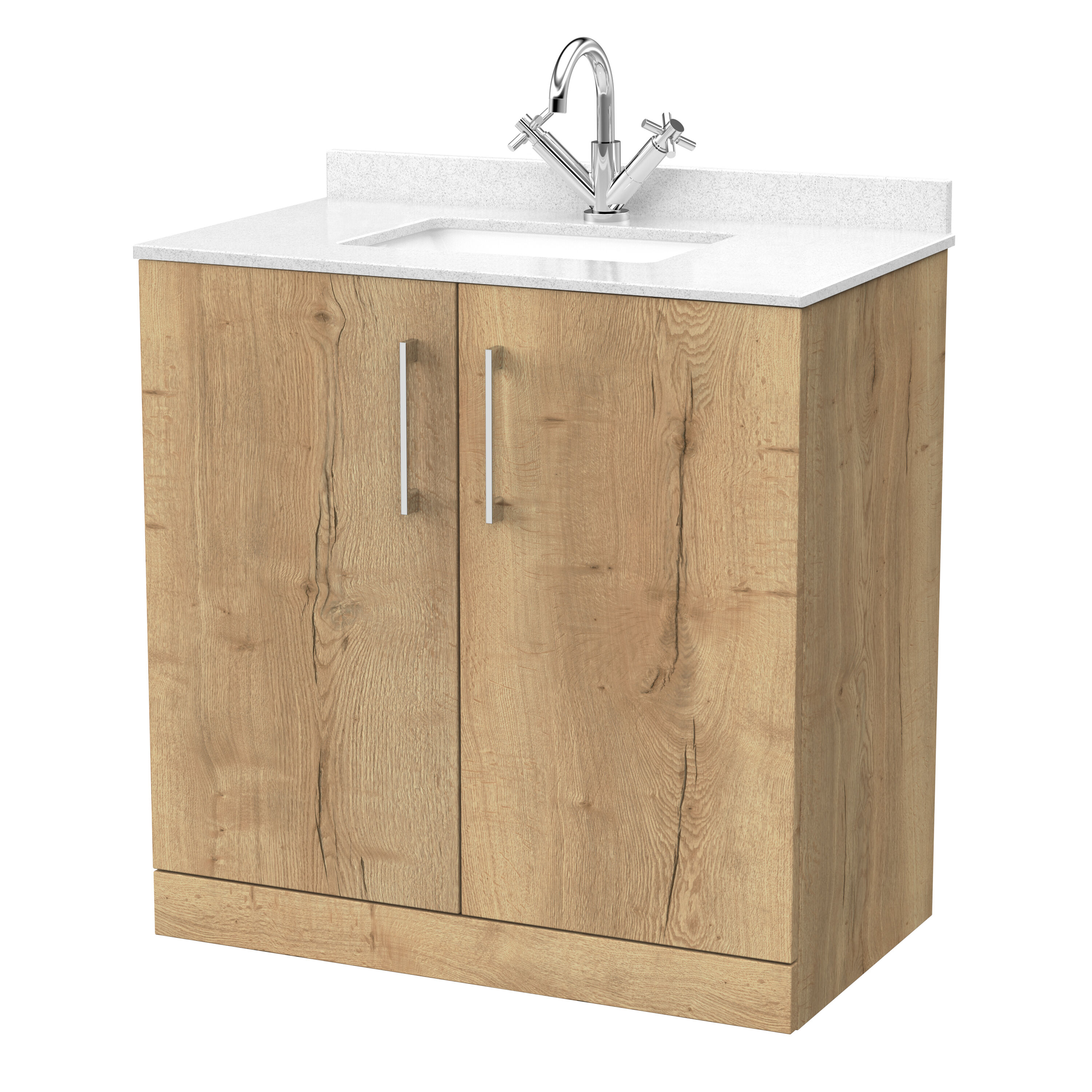 nuie Lux Kivo 800mm 2-Door Floor Standing Unit with a Single Bowl Marble Top 1 Tap Hole in White - Autumn Oak