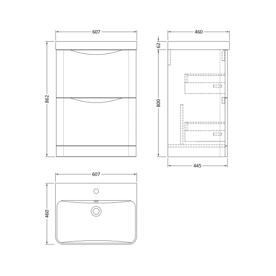 nuie Lunar Floor Standing 2 Drawer Unit & Thin Edge Ceramic Basin, 600mm - Satin Grey